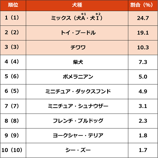 飼育犬種ランキングでは、小型犬種が多くランクインすることが特徴的ですが、1位から10位についても8位「フレンチ・ブルドッグ」を除きすべて小型犬種となっています。