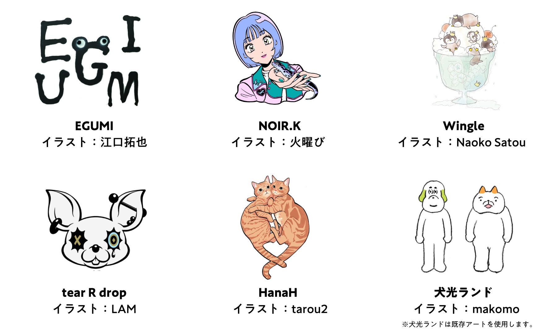 本イベントでは、江口拓也氏の「EGUMI」、小野賢章氏の 「NOIR.K」、代永翼氏の「Wingle」、木村良平氏の「tear R drop」、花江夏樹氏の「HanaH」、西山宏太朗氏の「犬光ランド」の全6ブランドが参加いたします。TAKALAKA MUSEUMという名前にちなみ本イベントのためのアートも作成。アートを使用した新作アパレル及びオリジナルグッズを販売いたします。各商品は本POP UP SHOPでの販売、公式サイトにて8月10日(木)より受注販売も行います。
