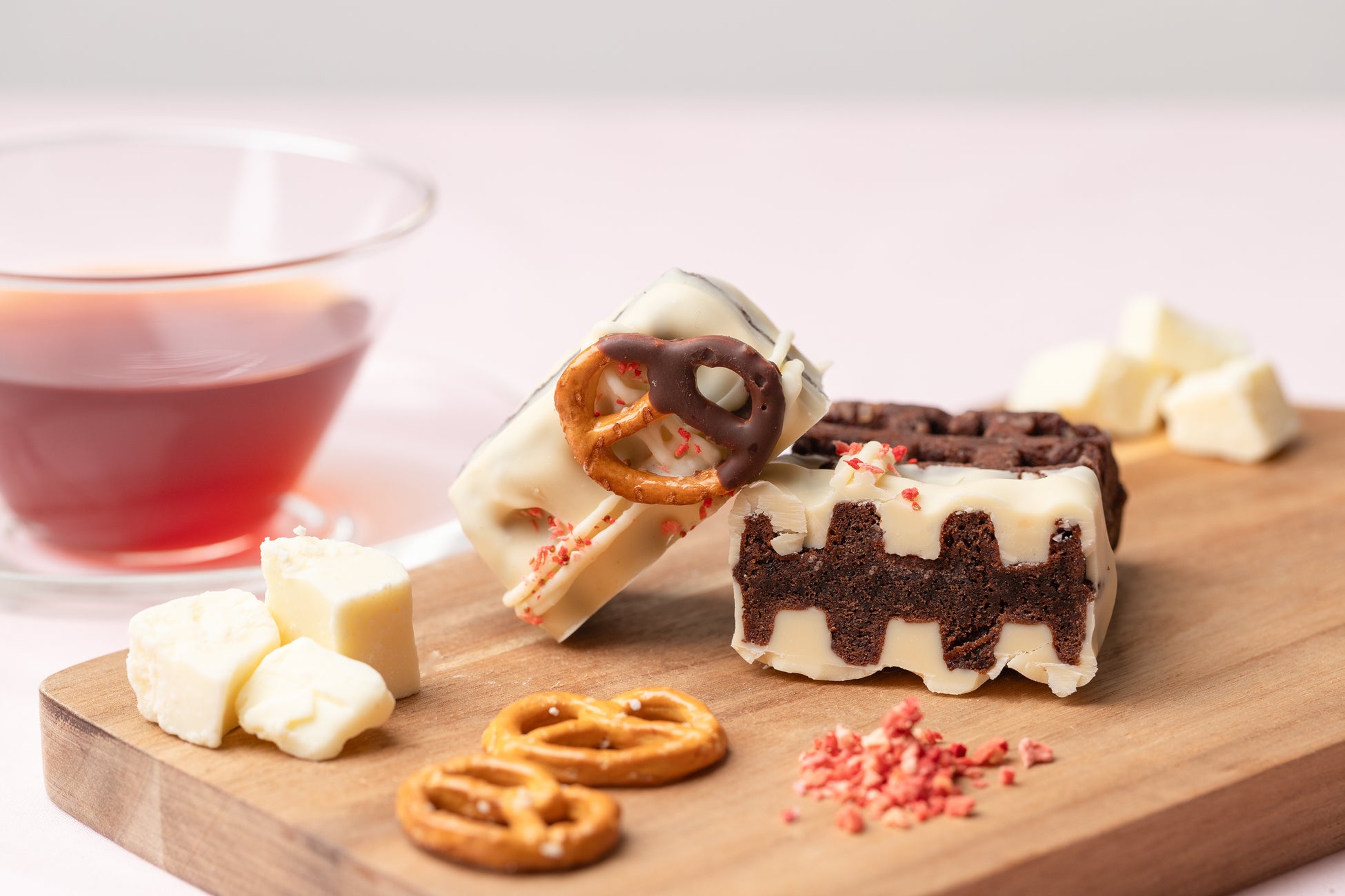 大粒ザラメとココアパウダーが入ったしっとり滑らかな京ワッフルの生地に、ホワイトチョコレートやストロベリーチョコレートをコーティング。