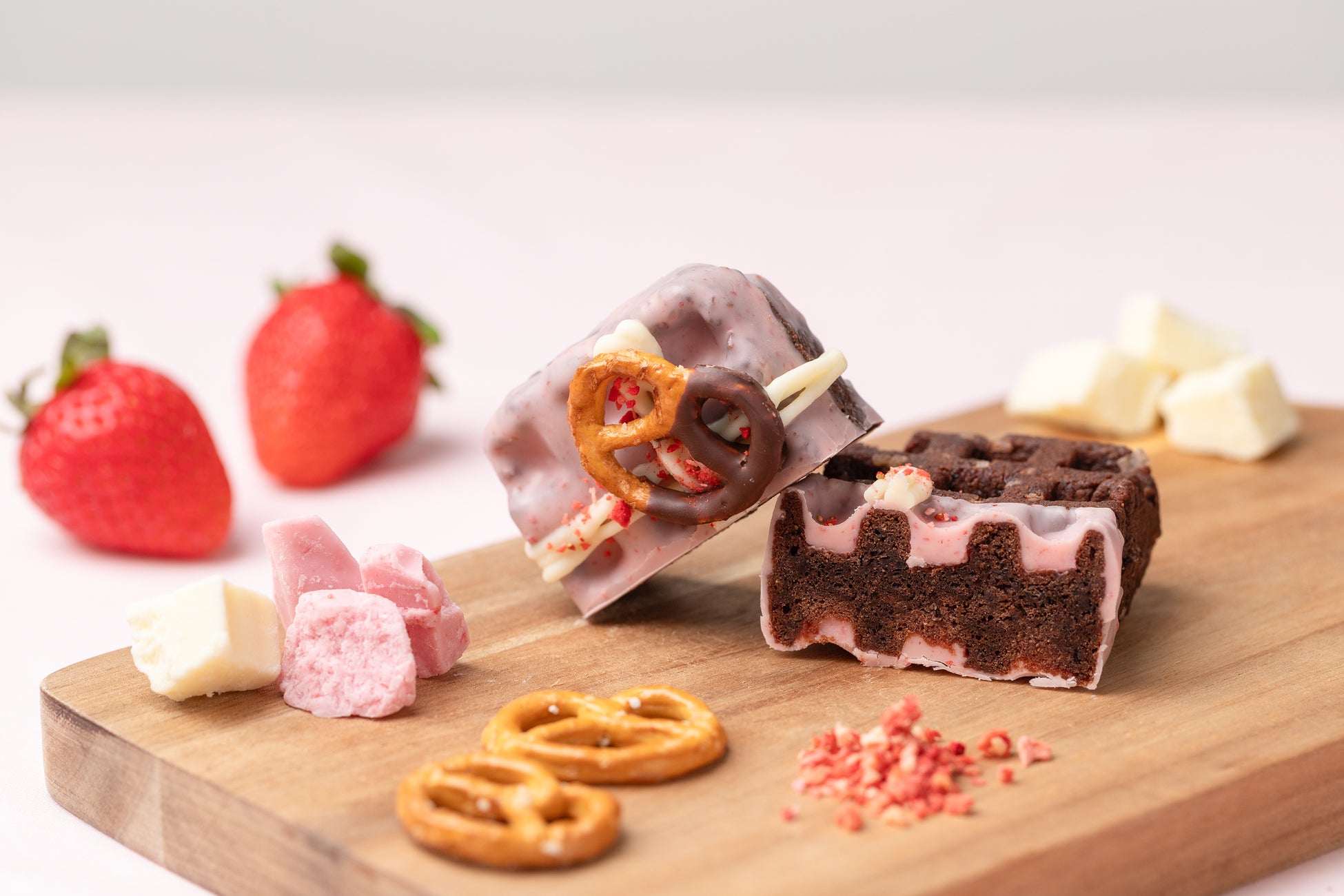 「パキッ」と音がなるほど分厚くコーティングされたチョコ、「カリッ」としたアクセントのストロベリーフレークやプレッツェル、「しっとりふわふわ」なワッフル生地により、様々な食感を楽しめる濃厚で食べ応えのあるフレーバーです。