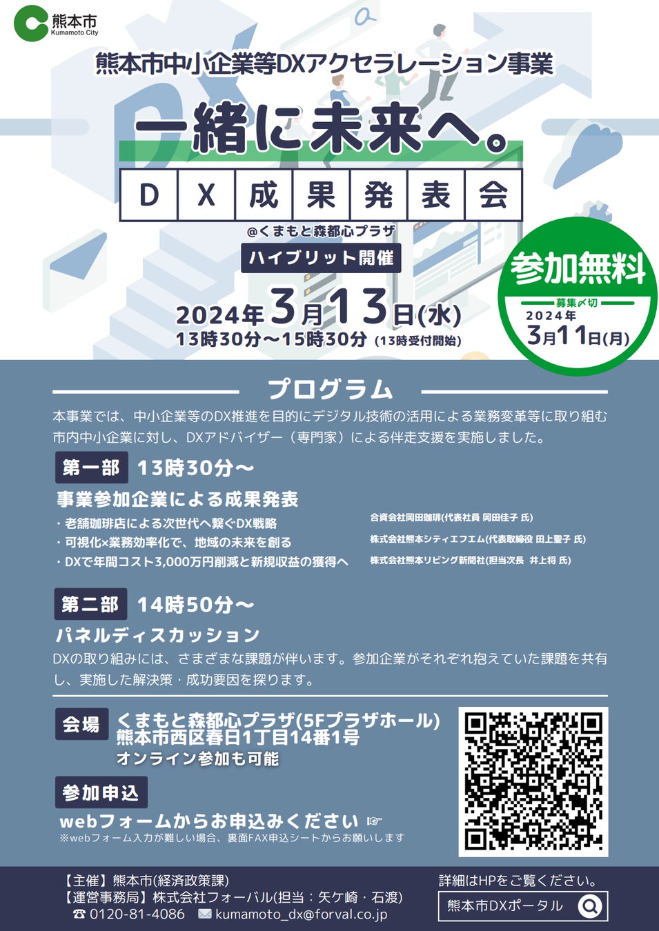 今回、約半年間の支援を受けられた市内中小企業を代表して3社による成果発表として、「熊本市中小企業等DXアクセラレーション事業成果発表会~一緒に未来へ。~」を開催いたします。