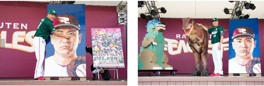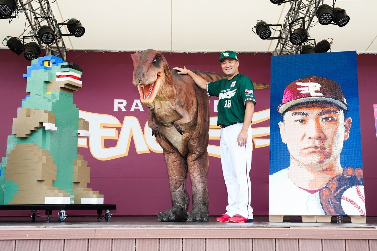 お披露目会当日は、田中将大選手ご本人がご登壇。高さ2mの巨大なレゴ ブロックウォールアートに驚く場面や、レゴ ブロックウォールアートに最後の2ピースをはめて作品を完成させるシーン、さらにお子さまとレゴ ブロックで遊んだ際のエピソードなどを披露いただきました。さらに、レゴ ブロックでできた高さ180cm超えの巨大恐竜もステージ上に設置されるなど、地域に根差し、幅広い年齢の方々が訪れるボールパークを有する東北楽天ゴールデンイーグルスと、ご家族みなさんで楽しんでいただけるレゴ ブロックの、相性抜群なプロ野球界初となるレゴジャパンとのコラボレーションを大いに盛り上げていただきました。