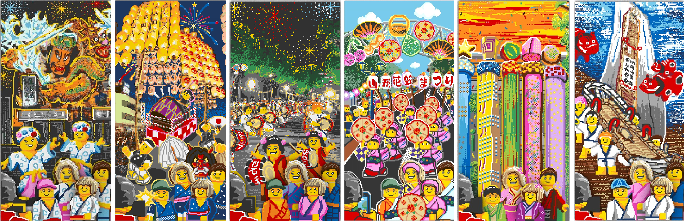 さらに、東北6県を代表する夏祭りを一堂に楽しめるワークショップも開催します。みんなで組み立てる青森ねぶた祭、秋田竿燈まつり、盛岡さんさ踊り、山形花笠まつり、仙台七夕まつり、福島わらじまつりをモデルとした6体の高さ2m、幅1m、約31,000ピース※2のレゴ ブロックモザイクアートからは、本物のお祭りさながらの迫力をお楽しみいただけます。