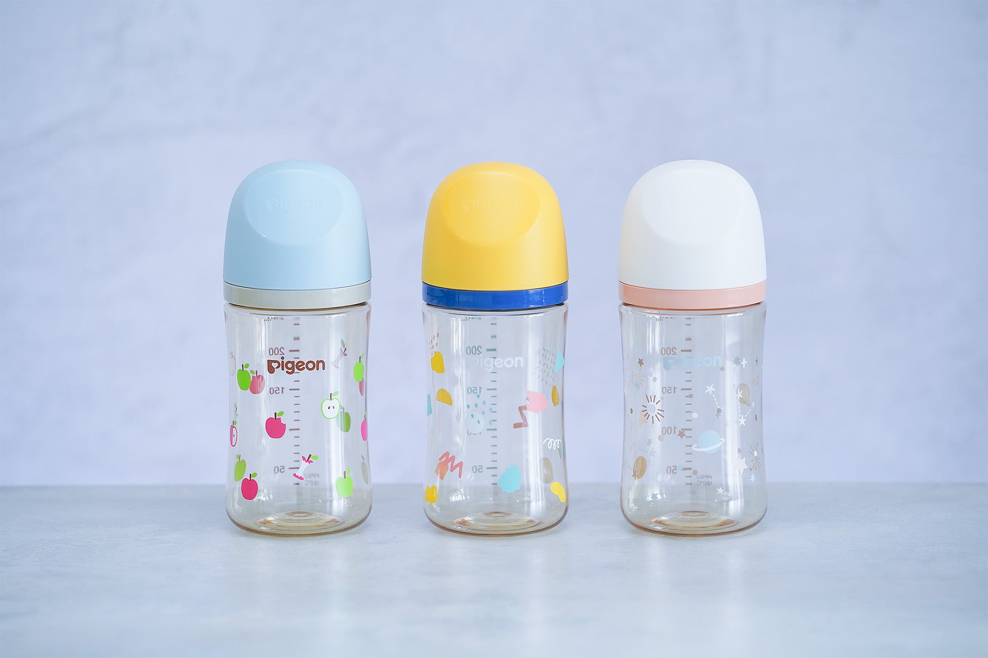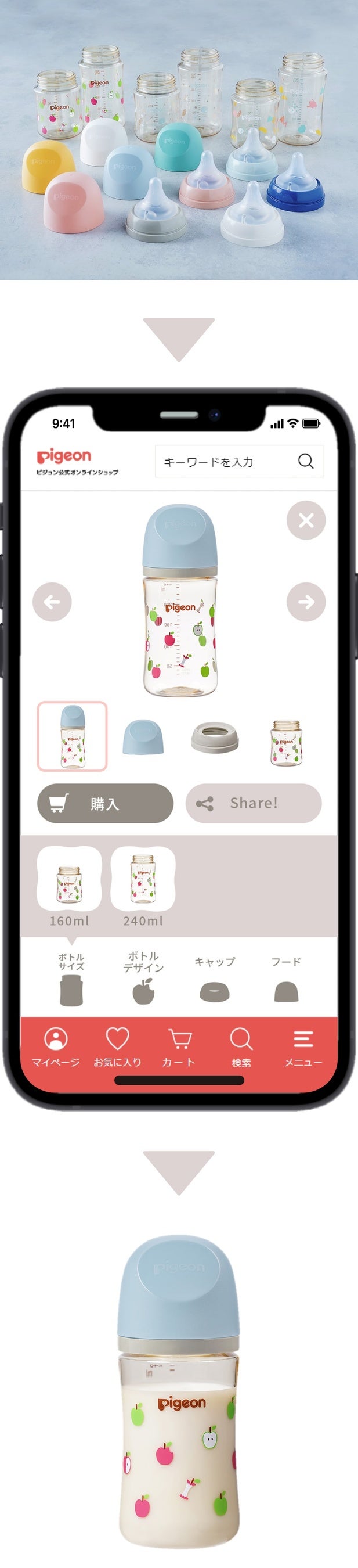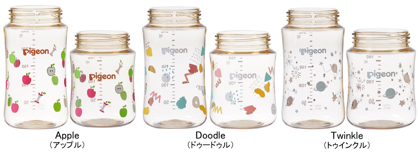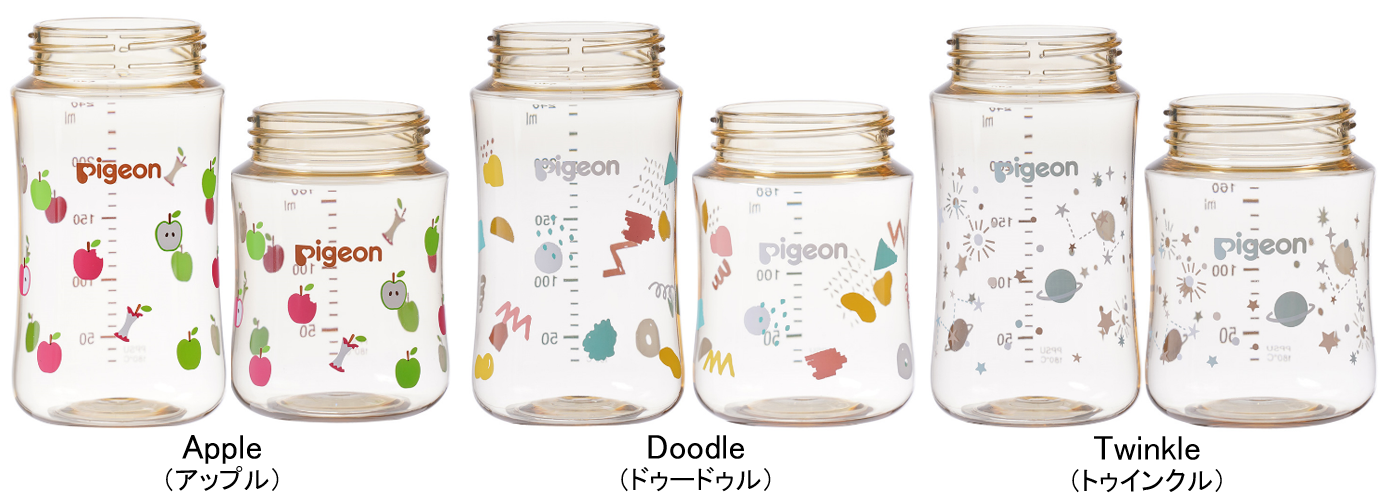 哺乳器の国内シェアNo.1(※2)である当社は、「大切な赤ちゃんのために、特別な育児用品を選びたい」というママ・パパの気持ちに応えるべく、哺乳びんを150通りにカスタマイズできる「My母乳実感」を開発。ボトルは「Apple(アップル)」「Doodle(ドゥードゥル)」「Twinkle(トゥインクル)」の3つの新規デザインと2種の容量(160ml、240ml)から、フードとキャップはカラフルな各5種のカラーから選ぶことができます。