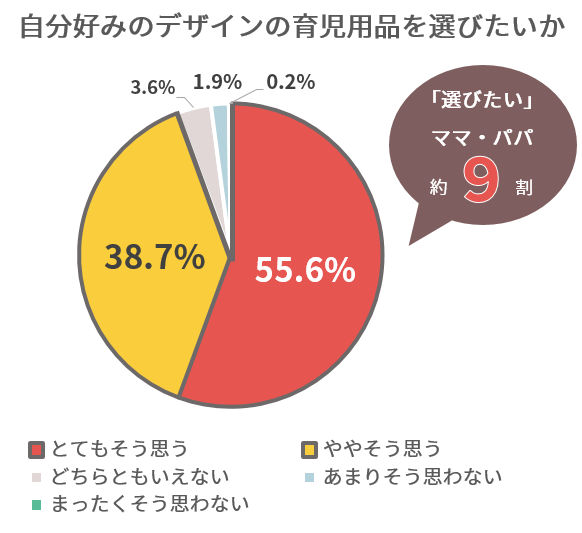 当社が実施した育児用品のカスタマイズに関する調査(※5)では、9割を超えるママ・パパが「お子さまの個性や好みに合わせたデザインの育児用品を選びたい」と回答されており、お子さま仕様にカスタマイズされた育児用品のニーズが非常に高いことが明らかになりました。