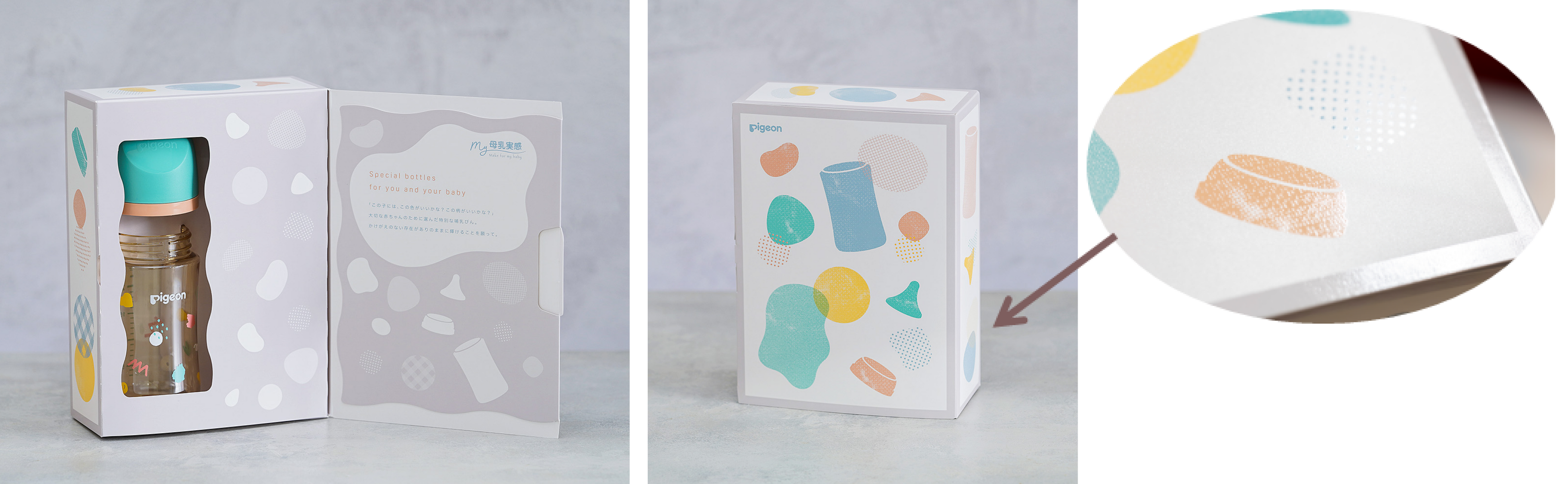ボックスの外側は、哺乳びんのパーツが散りばめられたデザインで、カスタマイズする楽しさ、ワクワク感を表現。また特別感が出るよう、光に反射するとエンボスの光沢が見える仕様に。内側はボトルデザインが引き立つシンプルなデザインかつ、落ち着いた色合いのグレージュでまとめています。