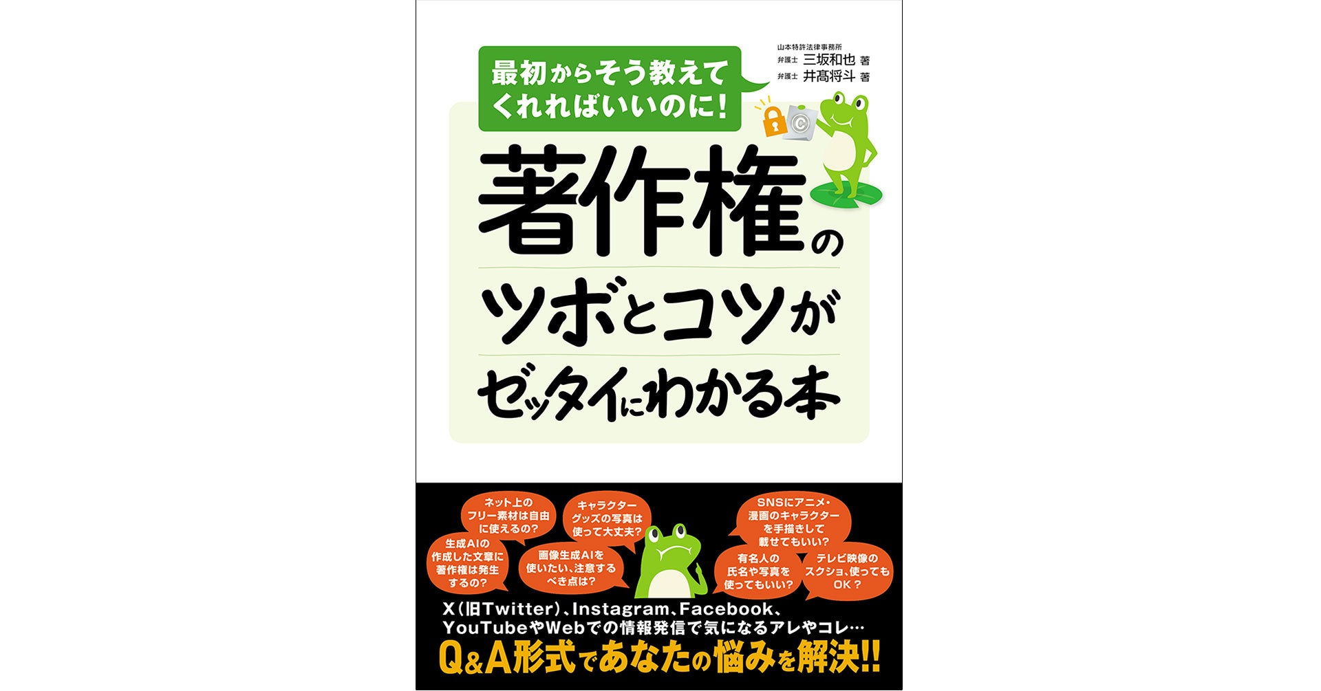 本書は、著作権のツボとコツをQ&A形式で解説しています。第1章では、「著作権とは何か?」ということを解説し、その後の2章~4章で情報発信する場面を「①文章」「②写真・画像」「③音楽・動画」の3つに分け、具体的な問題について解説していきます。第5章では、AIが作成した文章やイラスト、ChatGPT、画像生成AIの使用…など、著作権のその他のトピックについても触れています。