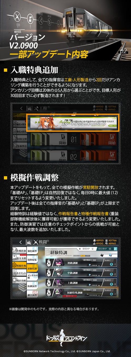 株式会社サンボーンジャパンは、スマホ向け戦略型シミュレーションゲーム『ドールズフロントライン(以下、「ドルフロ」)』において、6月24日(金) に予定しているストアアップデートの内容をお知らせいたします。