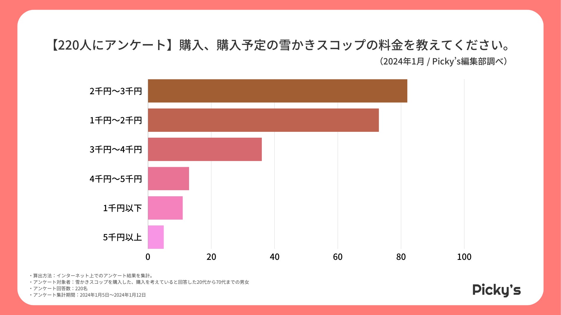 雪かきスコップの料金に関しては「2千円~3千円」の価格帯が最も選ばれていることが明らかになりました。手頃な価格で効果的な雪かきスコップを求めていることを示しています。2位の「1千円~2千円」、3位の「3千円~4千円」もそれぞれ支持を得ていますが、特に中価格帯が主流であるようです。4位の「4千円~5千円」と5位の「1千円以下」、そして6位の「5千円以上」の範囲はそれぞれ需要がありつつ、全体ではやや少ない傾向があります。
