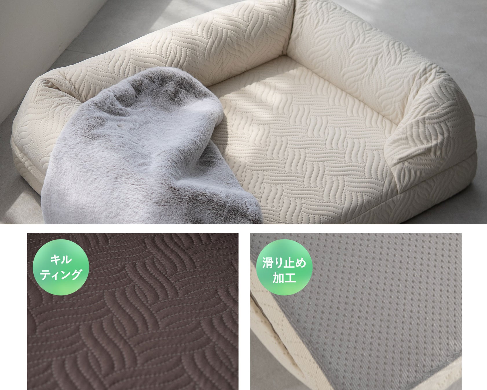 底面には、フローリングやタイルの上でもズレにくい滑り止め加工付き。愛犬がベッドに出入りする際も動きにくく、足元が安定しているため、特に小型犬やシニア犬にも安心してお使いいただけます。