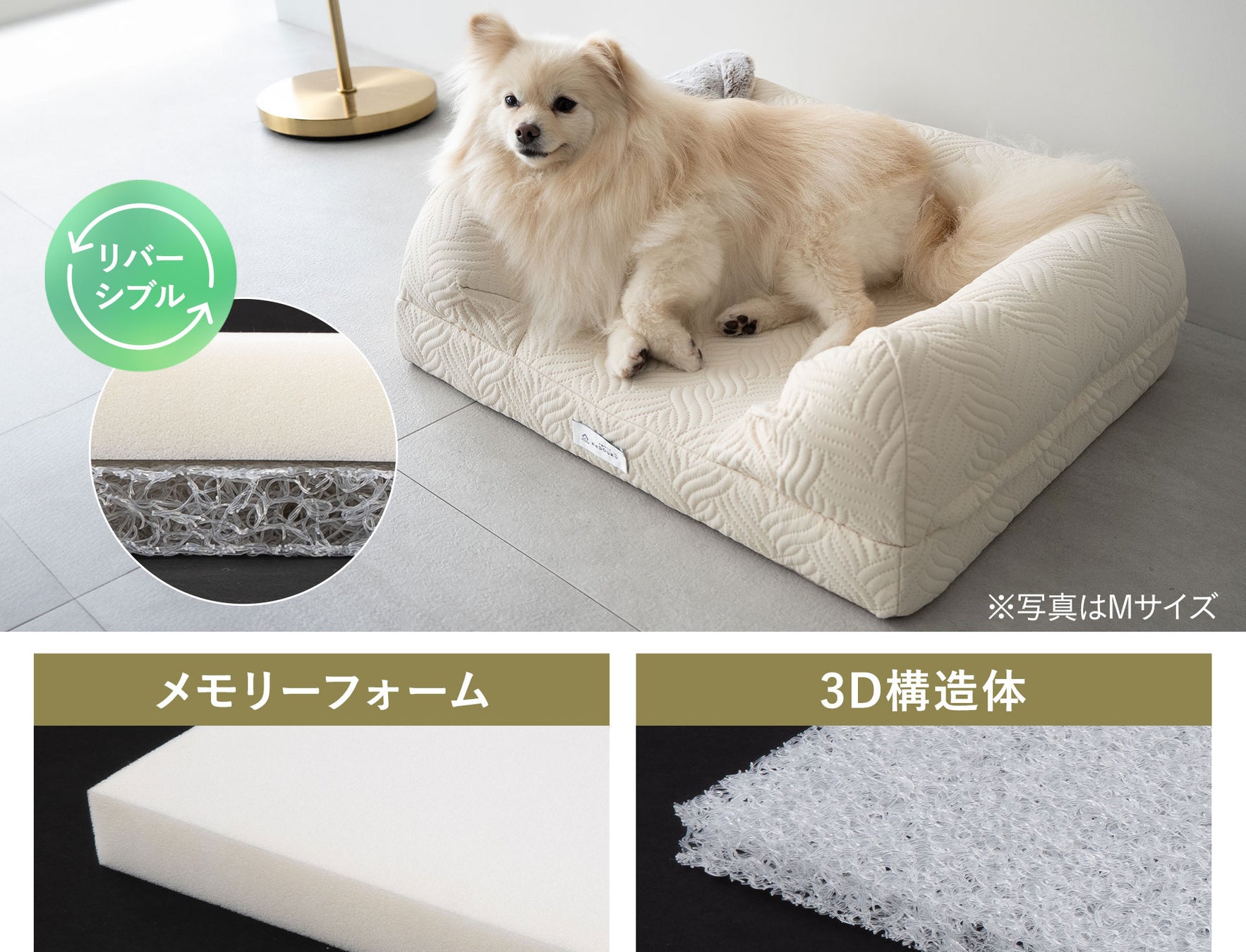 3Dベッドプレミアムは、人間用のハイクラスのマットレスで使われる2種類の中材を厳選して採用しました。上下面を入れ替えるだけで異なる機能・寝心地を選べるリバーシブル構造です。愛犬の年代・体調・季節に応じて最適な寝心地を選ぶことで、生涯使い続けられるドッグベッドを目指しました。