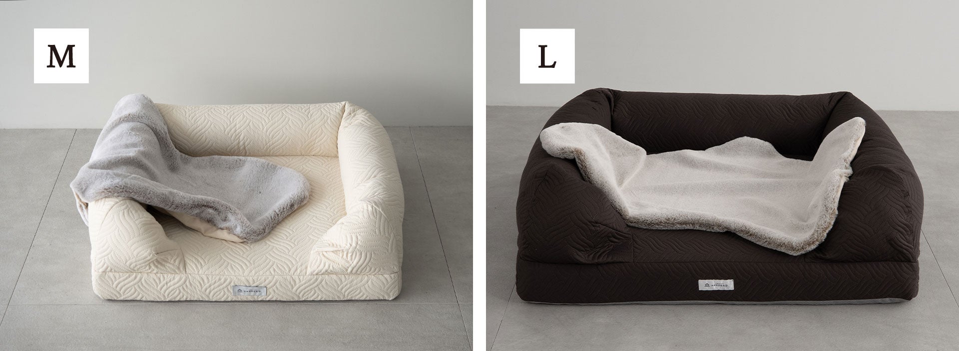 ■本体 Mサイズ:約幅62×奥行50×高さ16cm (内寸:約幅46×奥行42×厚み7cm) Lサイズ:約幅80×奥行68×高さ23cm (内寸:約幅55×奥行54×厚み9cm) ■ブランケット Mサイズ:約45×70cm Lサイズ:約55×85cm |