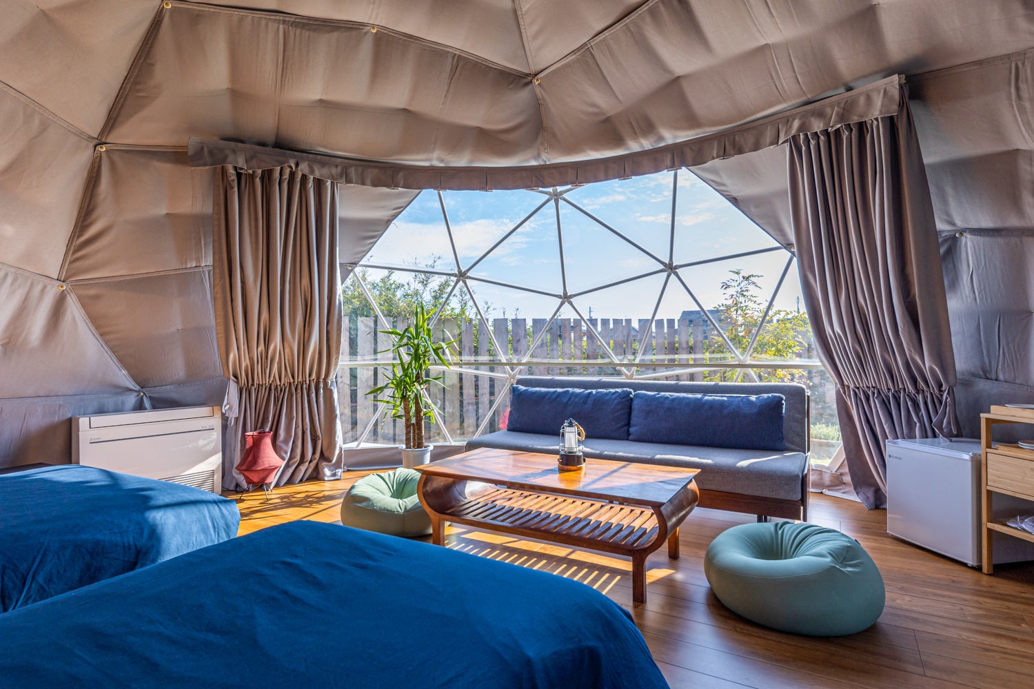 テント内は冷暖房完備で1年中快適に。ドームテントからすぐ側にある別棟にはシャワールーム、トイレを設けているのでアウトドア初心者の方も気兼ねなくお過ごしいただけます。