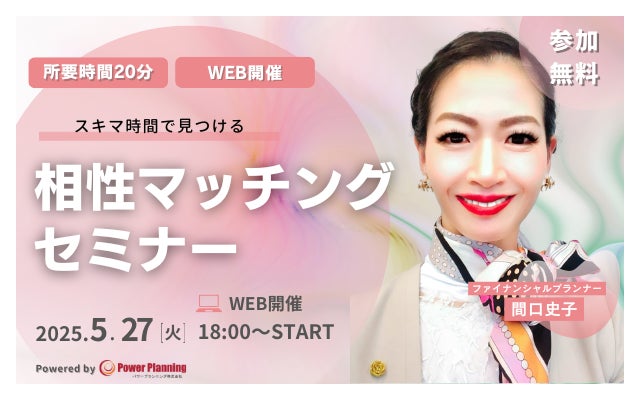 無料マネーセミナー提供サービス「アットセミナー」を運営しているパワープランニング株式会社が「5月27日(火) 18時」に「相性マッチングセミナー」というスキマ時間で自分に合ったFPを見つけられるオンラインセミナーを開催いたします。
