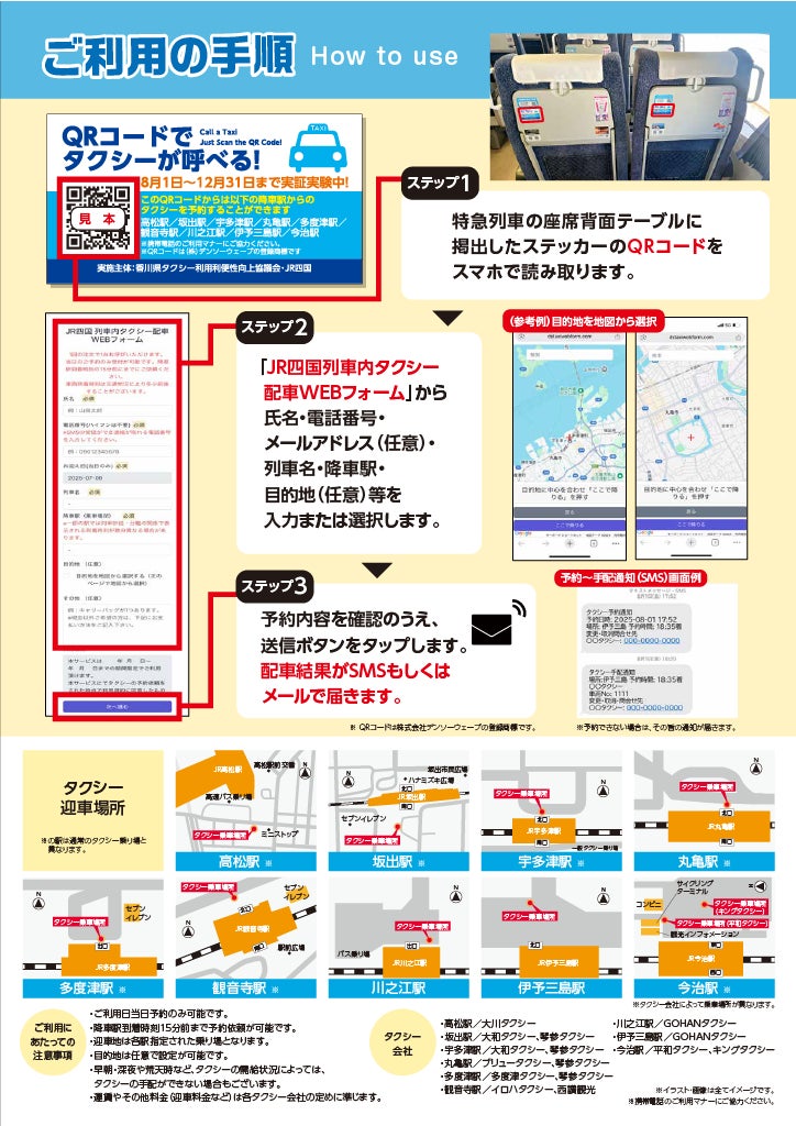 また、香川県内においては、香川県タクシー利用利便性向上協議会による「観光の足」確保に向けた実証実験と連携した取組みとなります。