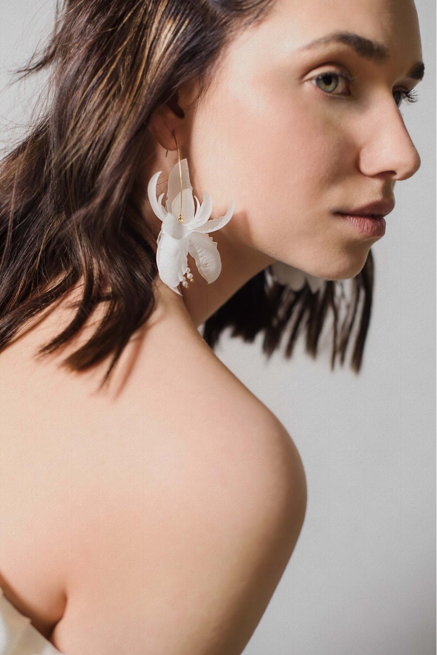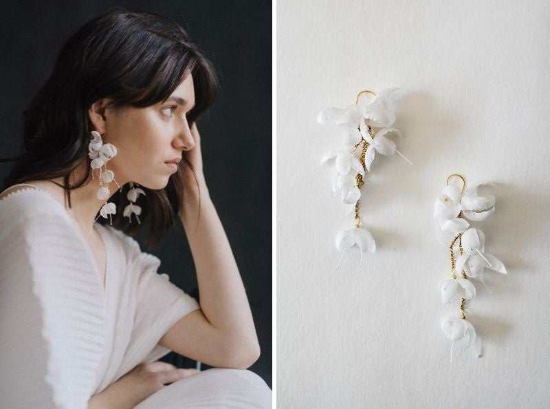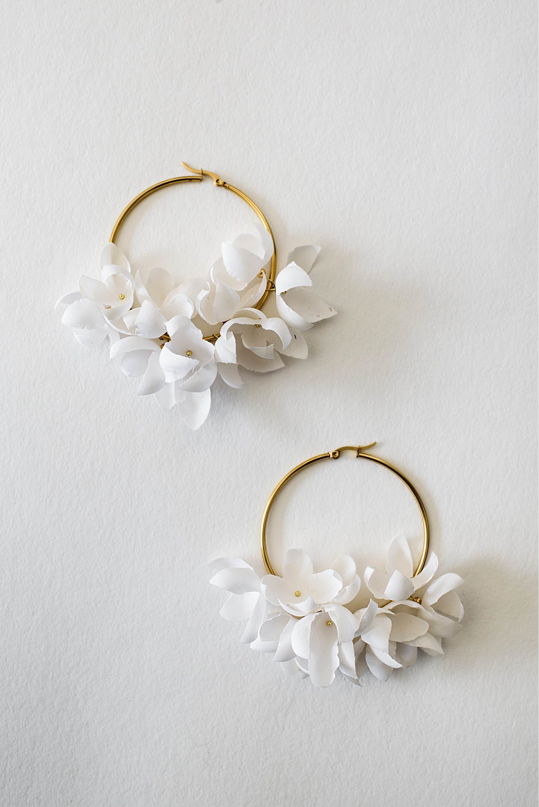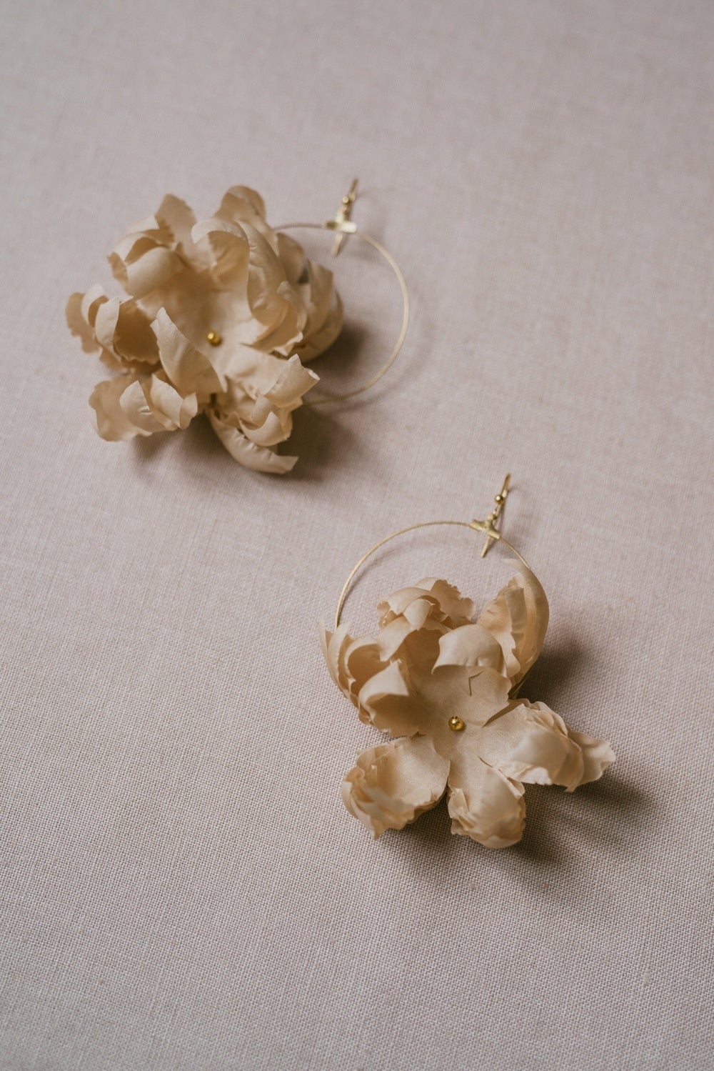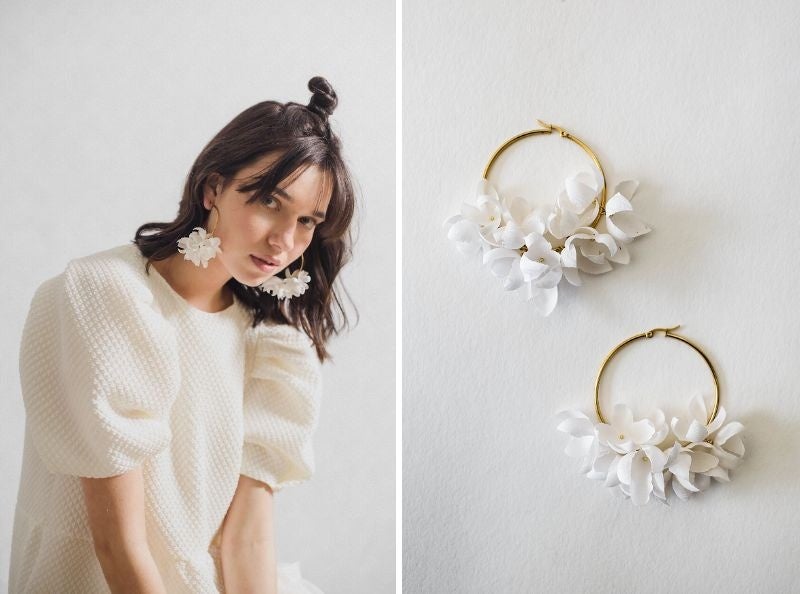 ふわりとしたフラワーのピアスや、オルテンシアの花をイメージしたゴールドコーティングされた真鍮フープに肩が大きくあいたドレスにフィットし美しさが更に強調されます。