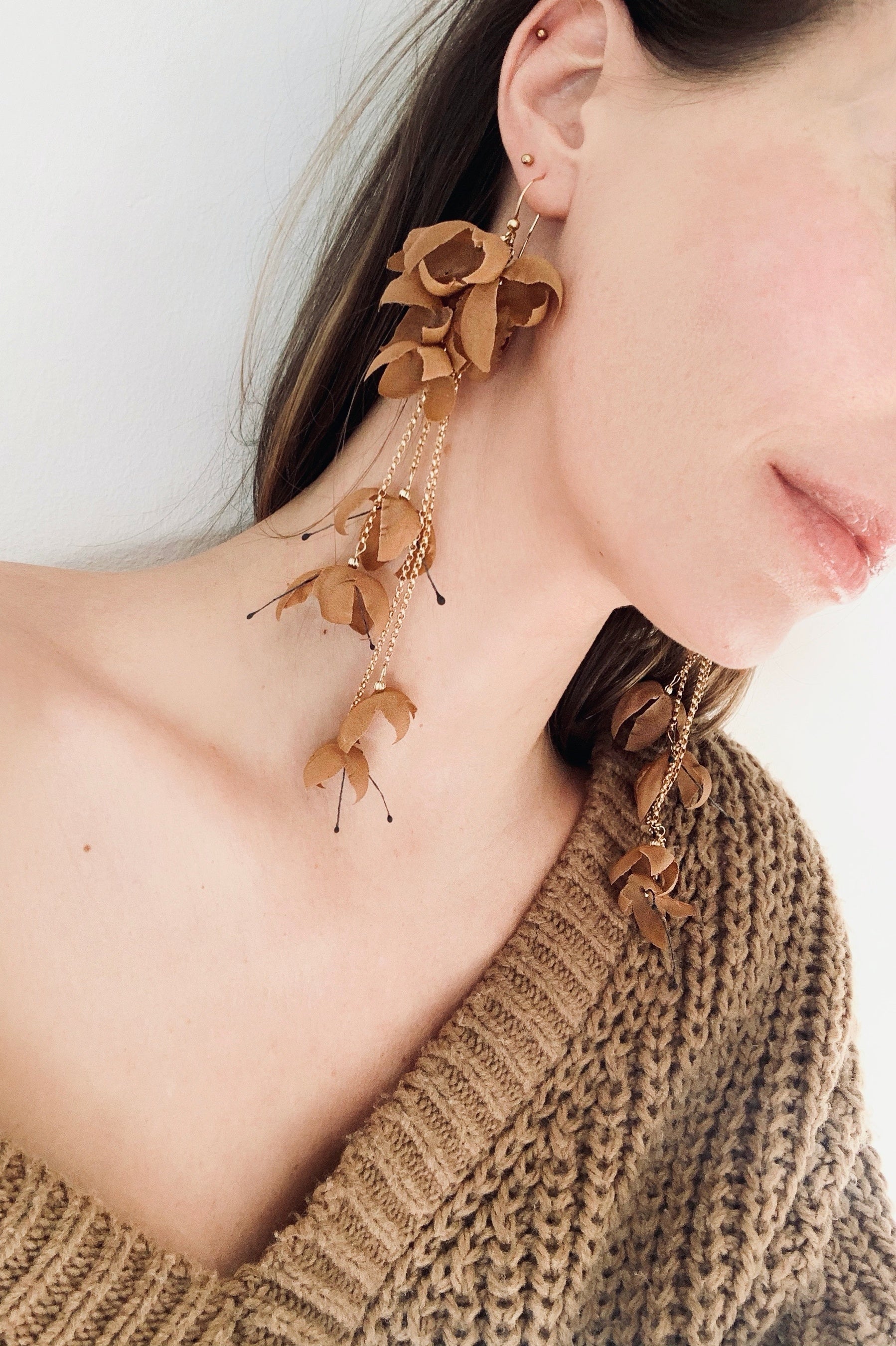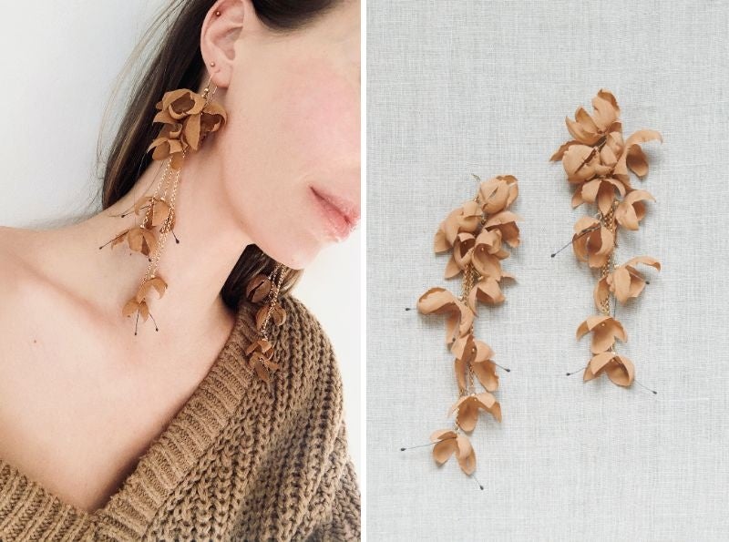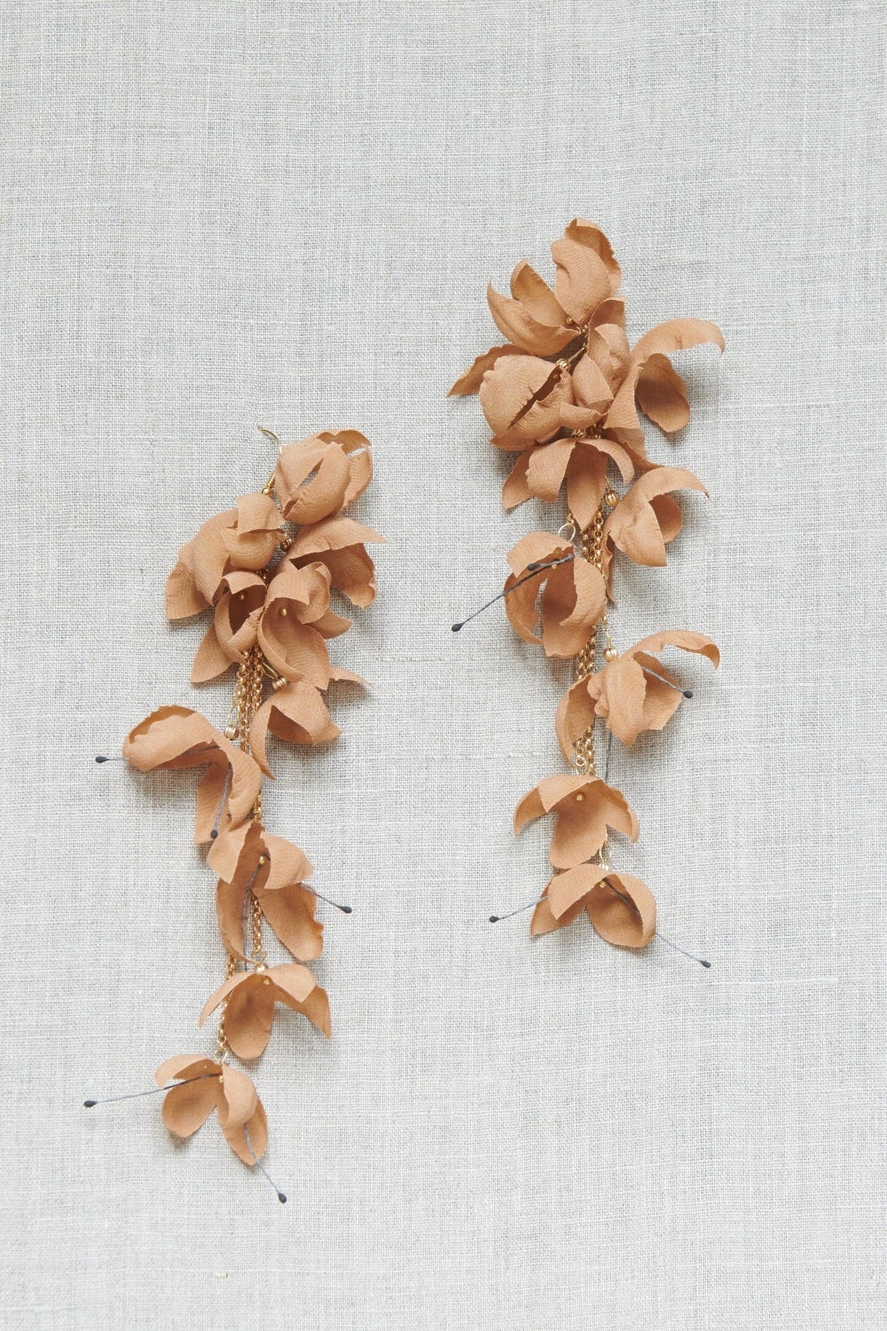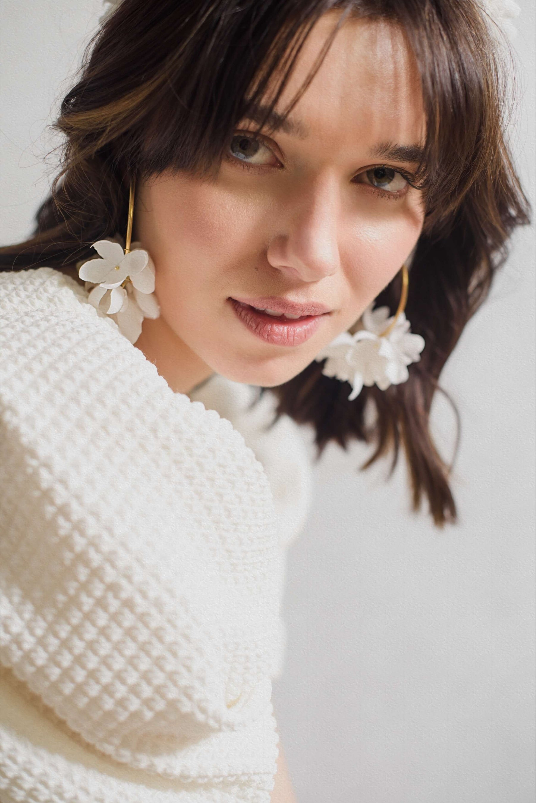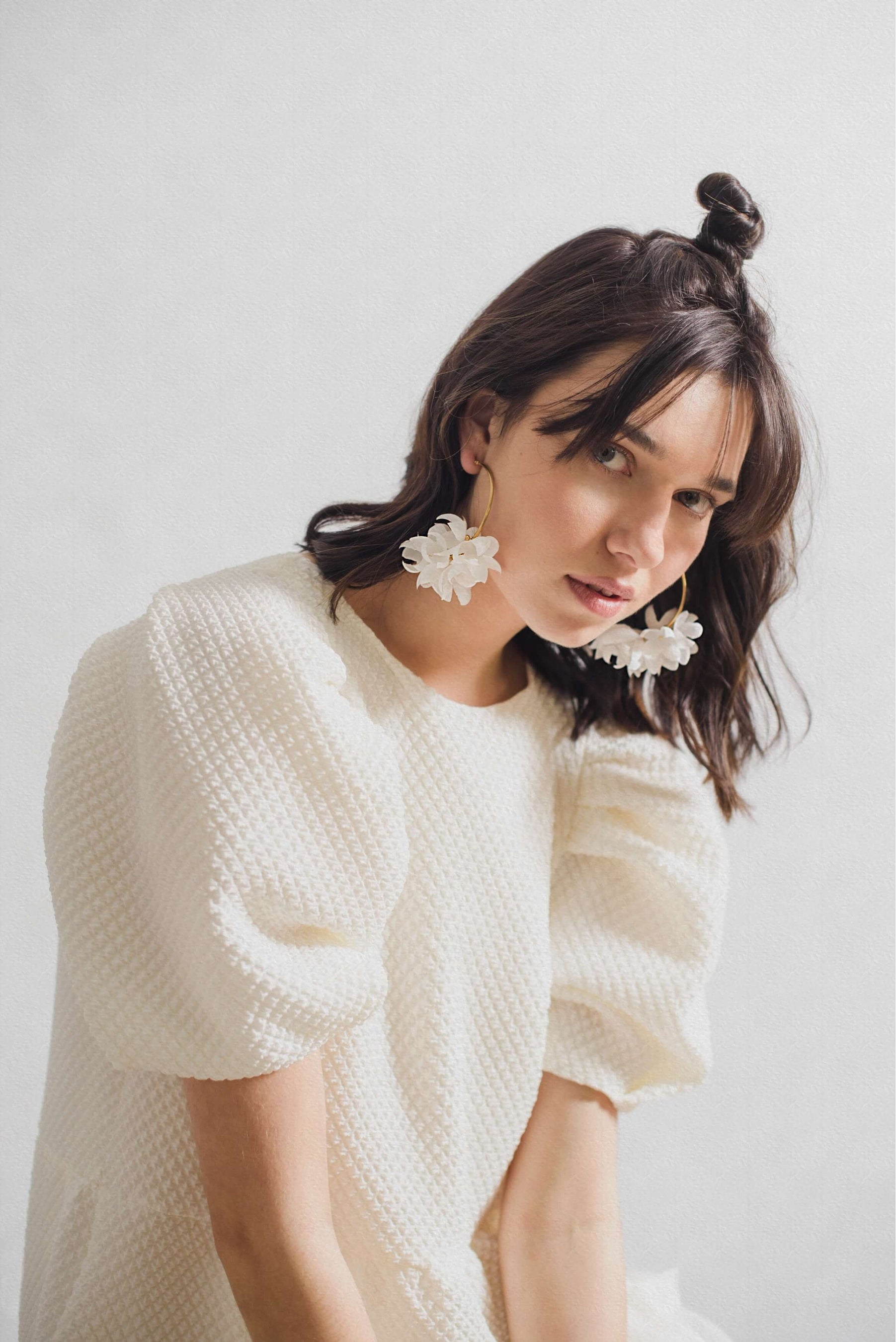 ふわりとしたフラワーのピアスや、オルテンシアの花をイメージしたゴールドコーティングされた真鍮フープに肩が大きくあいたドレスにフィットし美しさが更に強調されます。