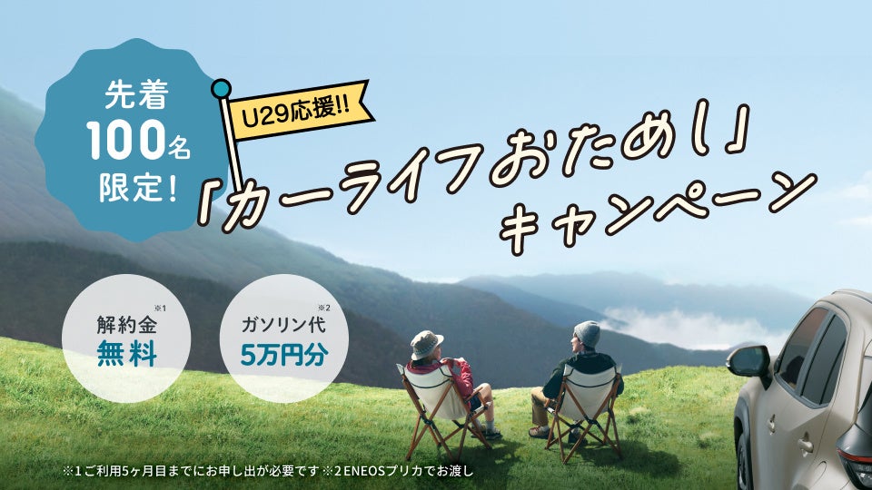 以下の申し込み条件を満たす方(先着100名様) ・お申し込み時点で29歳以下の方(法人契約は対象外) ・はじめてクルマをお持ちになる方 ・東京都・大阪府・愛知県・福岡県・長野県のキャンペーン対象店舗(WEB/店頭どちらでも可)でお申し込みいただける方 *⁴ ・簡単なWEBアンケートにご協力いただける方 |