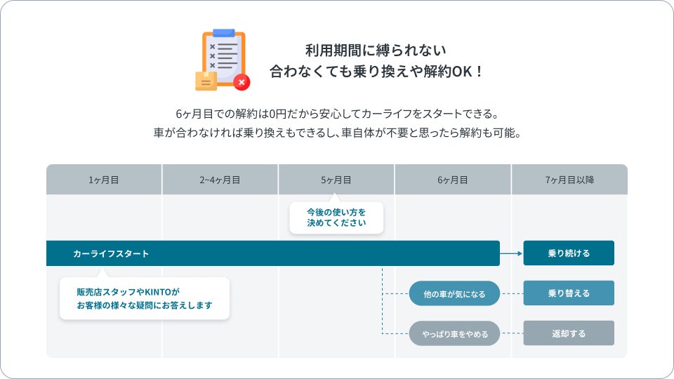 通常、初期費用フリープランの場合、契約期間の途中で解約をする際には、中途解約金が発生しますが、今回のキャンペーンでは、6カ月目の中途解約に限り、中途解約金を不要*²とします。まずは半年間クルマのある生活を体験していただき、そのうえで、ご自身にとって「クルマのタイプ(車種)が合っているか」、「クルマを乗り続けるか」をご判断いただけるため、気軽にクルマのある生活をスタートいただけます。