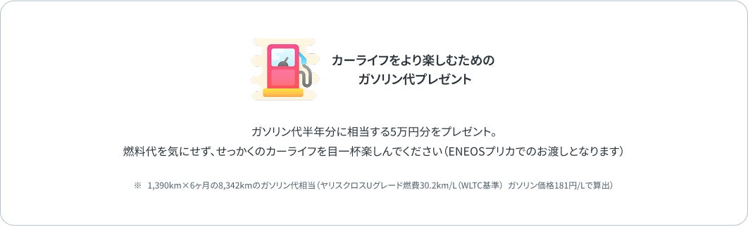 ガソリン代半年分に相当する5万円分*³のプリペイドカードをプレゼント。はじめてのクルマでも安心な安全性能を備え、ハイブリッド車ならではの優れた低燃費と爽快な走りが魅力の「ヤリスクロス」で、ガソリン代を気にせず、ぜひおでかけを楽しんでください。