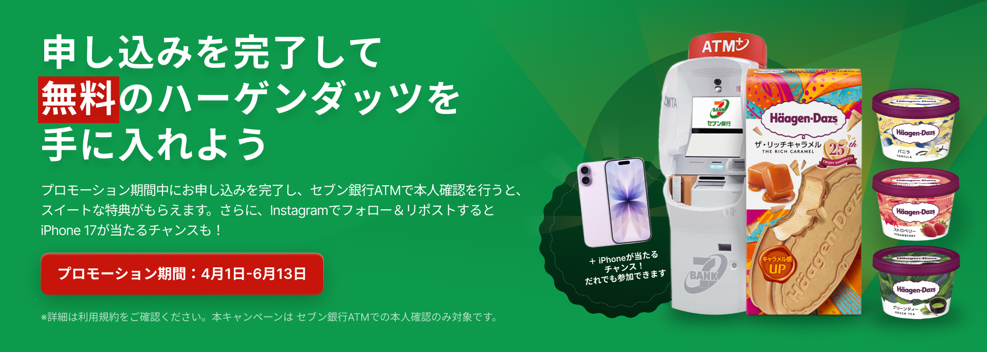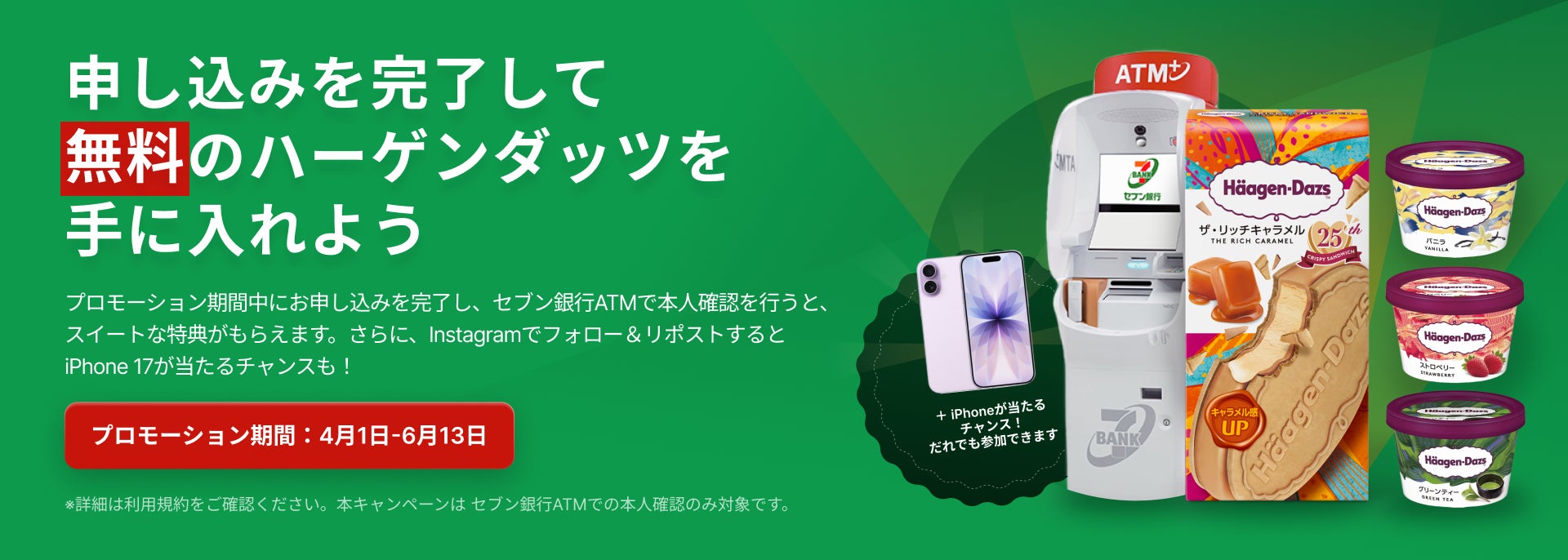 4月1日(水)〜6月13日(土)の期間中にCALL SIMをお申し込みいただきセブン銀行の「ATM窓口」での本人確認を完了された新規ご契約者様に、もれなくセブン-イレブンで交換できるハーゲンダッツ1つをプレゼントいたします。