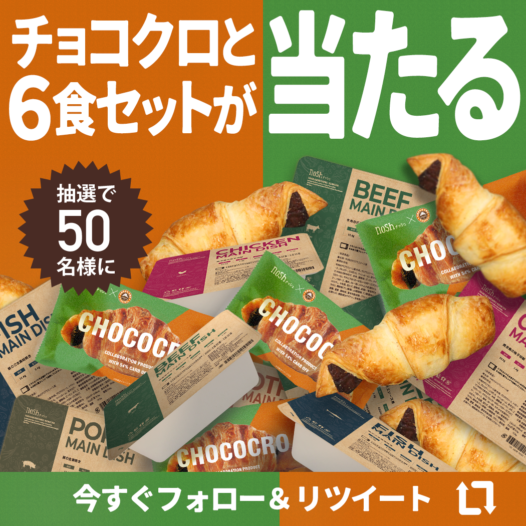 手軽に美味しく栄養管理ができる冷凍宅配食サービス「nosh」を手掛けるナッシュ株式会社(本社・大阪市、代表取締役 田中 智也)は、2022年6月28日に登場したサンマルクカフェとのコラボ商品「糖質ハーフチョコクロ」(https://nosh.jp/lp/collabosaintmarccafe)が注文殺到のため一時売り切れとなっていましたが、この度再入荷いたしました。再入荷を記念して「糖質ハーフチョコクロ」を含む6食セットが100名様にあたるキャンペーンを7月8日(金)より開始いたします。