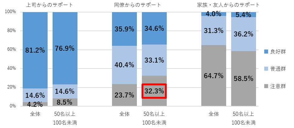 「周囲のサポート(ソーシャルサポート)」は、「上司からのサポート」「同僚からのサポート」「家族・友人からのサポート」にて構成されている。これらについても同様に比較したところ、小規模な企業は「上司からのサポート」「同僚からのサポート」について注意が必要な企業が全体に比べて多く、特に「同僚からのサポート」は、3割を超える企業(32.3%)が「注意」の水準であることがわかった。