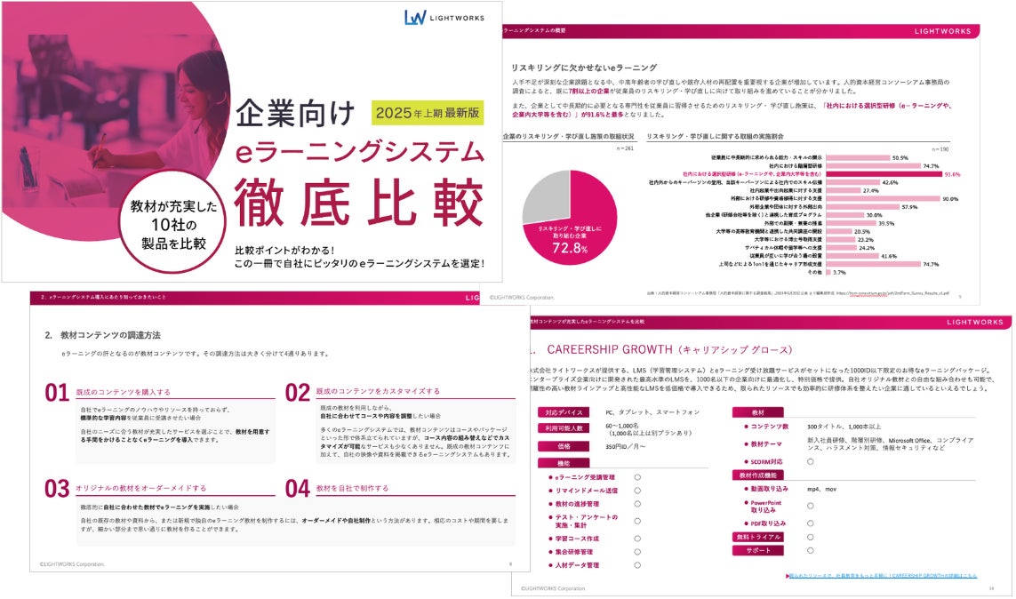 企業向けeラーニングコンテンツや学習管理システム(LMS)を開発・提供する株式会社ライトワークス(本社:東京都千代田区、代表取締役:江口夏郎、以下ライトワークス)は、企業向けeラーニングシステムの最新動向と選定ポイントをまとめた「企業向けeラーニングシステム徹底比較2025年上期最新版」の無償提供を開始しました。本資料では、eラーニングシステムの主要機能や導入時の比較ポイントに加え、主要ベンダー10社のeラーニングシステムを徹底比較。社内研修の効率化と自律学習・リスキリング施策を支援します。
