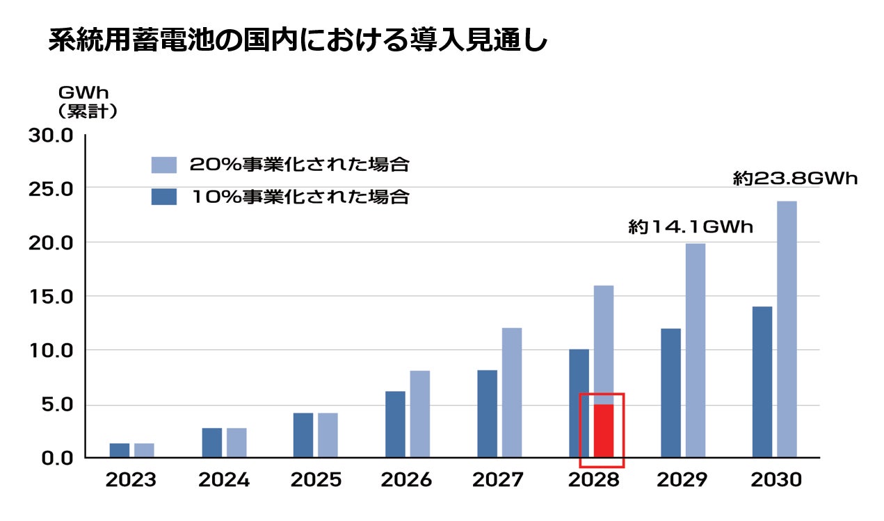 これによると当社が掲げる5.3GWhは、2028年度時点で20%事業化された場合の系統用蓄電地導入量の3分の1程度に相当し、単一事業者としては国内有数の規模で系統用蓄電池を展開しております。