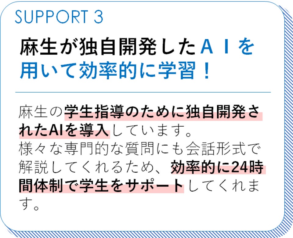 本校では、学生指導のために独自開発されたAIを導入しています。24時間いつでも専門的な質問に対応し、一人ひとりのペースに合わせた学習サポートを実現しています。