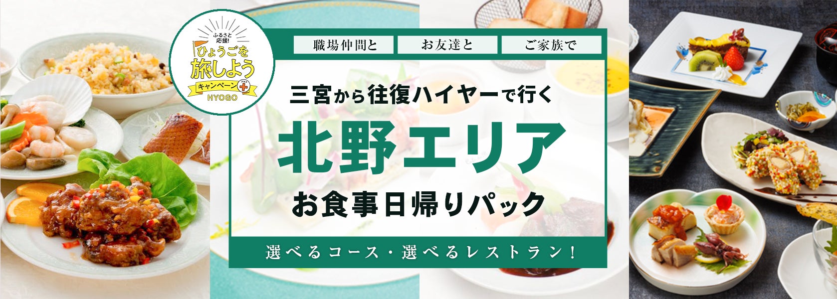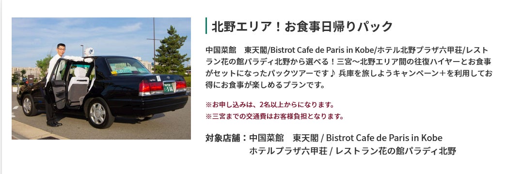 中国菜館 東天閣/Bistrot Cafe de Paris in Kobe/ホテル北野プラザ六甲荘/レストラン花の館パラディ北野から選べる!三ノ宮~北野坂エリア間の往復ハイヤーとお食事がセットになったパックツアーです♪ ひょうごを旅しようキャンペーン+を利用してお得にお食事が楽しめるプランです。