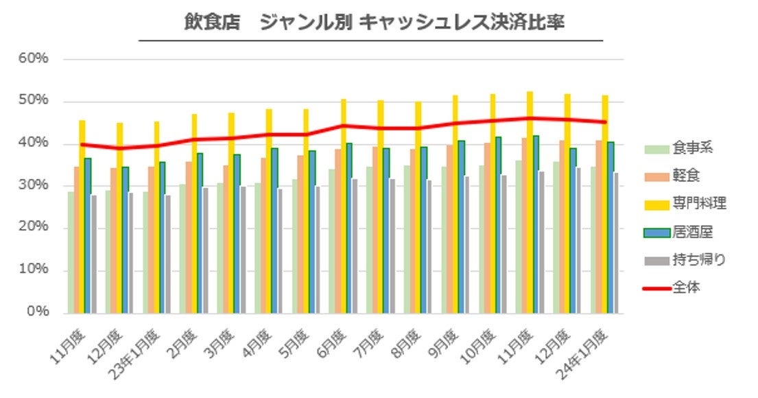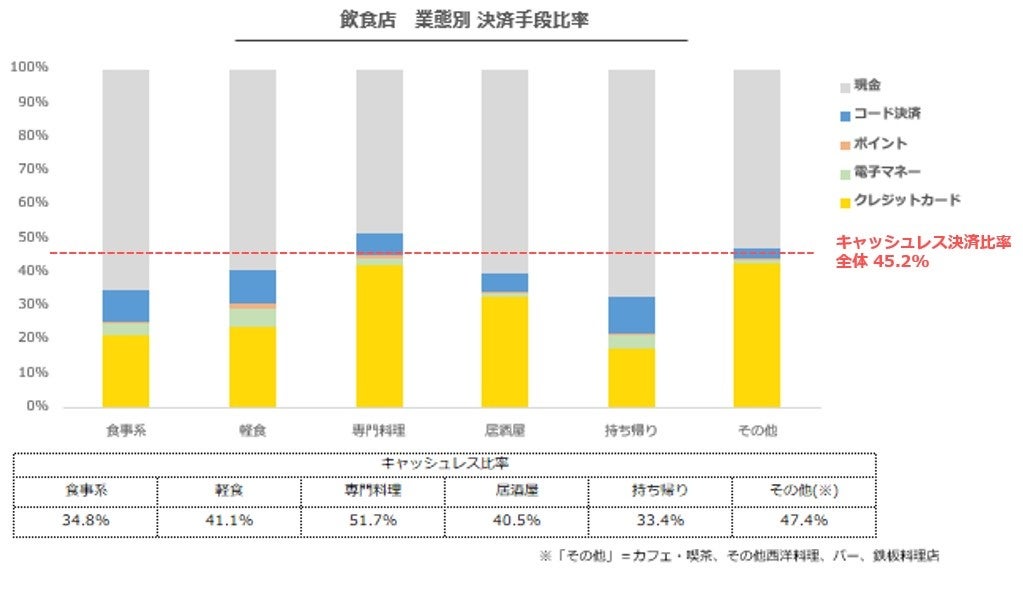 業態別のキャッシュレス比率は、軽食、専門料理、居酒屋で40%を超える。