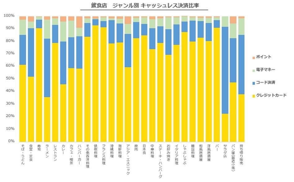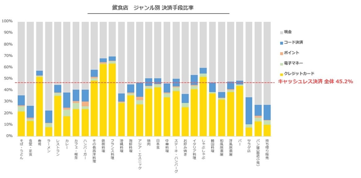 集計内容:飲食店 ジャンル別 キャッシュレス決済方法比率、キャッシュレス決済比率(内訳)