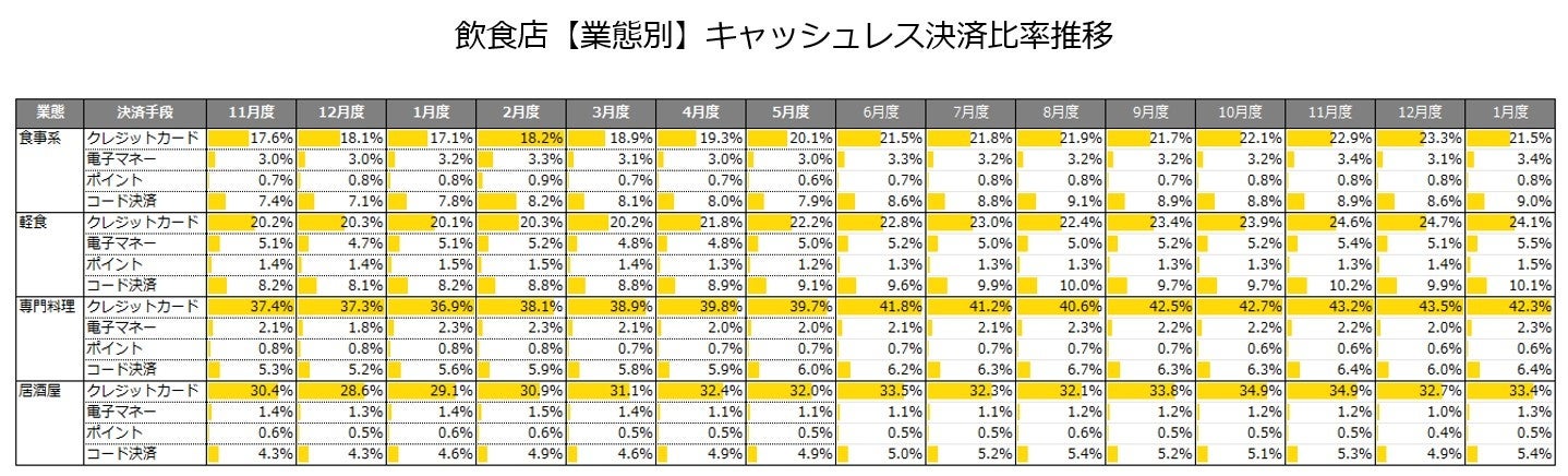 ・飲食店【業態別】キャッシュレス決済比率推移では、12月度から1月度で比較すると、すべての業態で