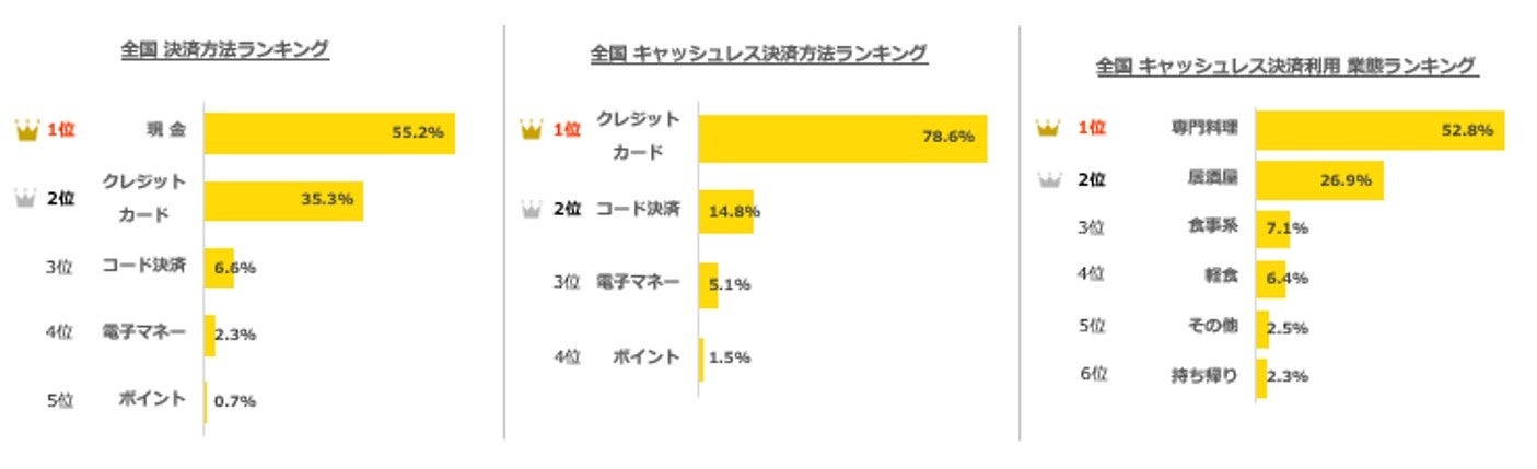・キャッシュレス決済方法のランキングは、クレジットカードが78.6%、次いでコード決済は14.8%となった。