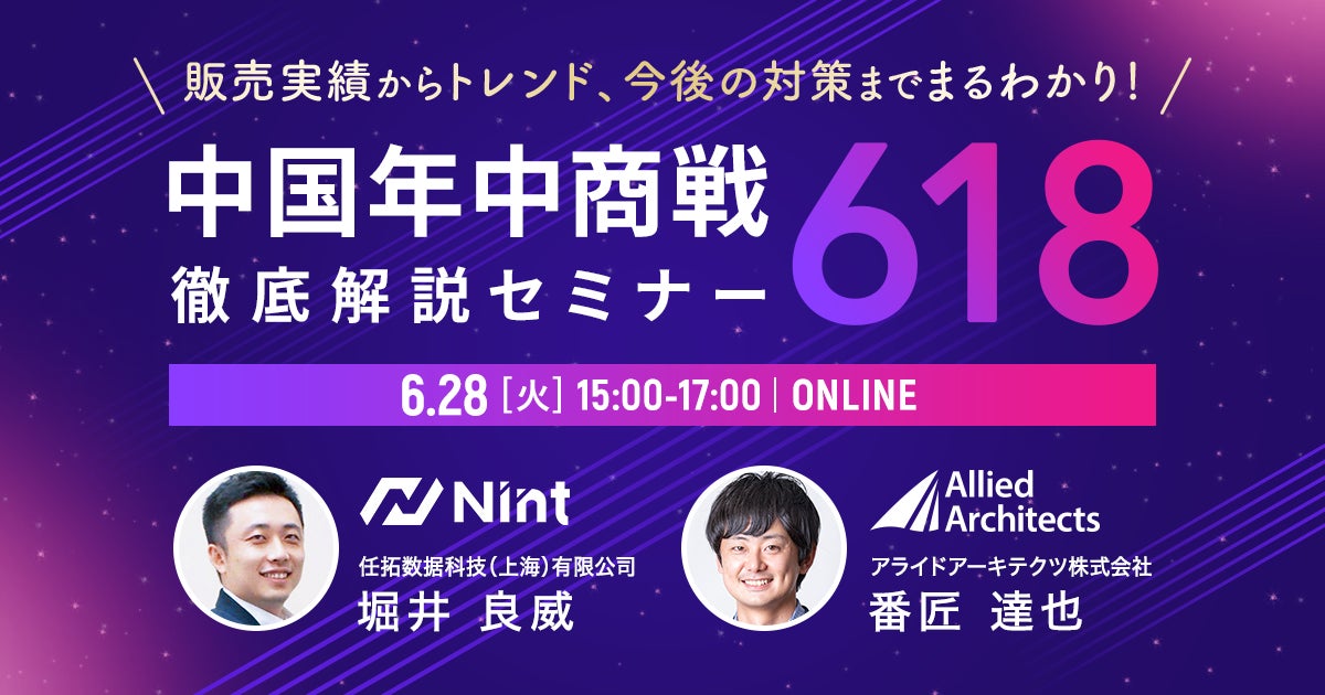 SaaSとデジタル人材で企業のマーケティングDXを支援するアライドアーキテクツ株式会社(東京都渋谷区、代表取締役社長 CEO:中村壮秀、クロスボーダーカンパニー プレジデント:番匠達也、証券コード:6081)は、ECモールの市場動向データを提供する株式会社Nint(本社:東京都新宿区、代表取締役:吉野順子、以下Nint)と共同で、中国展開を実施中・検討中の日本企業様を対象とした「中国年中商戦618徹底解説セミナー」を6月28日(火)に開催いたします。