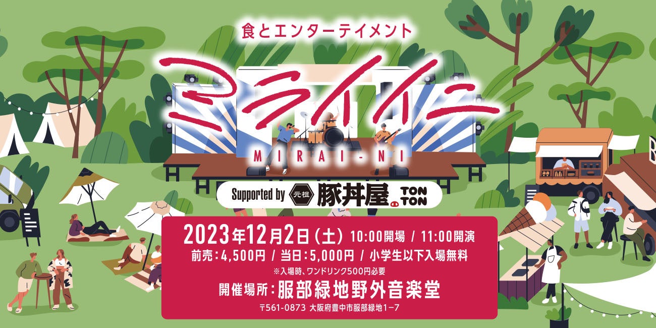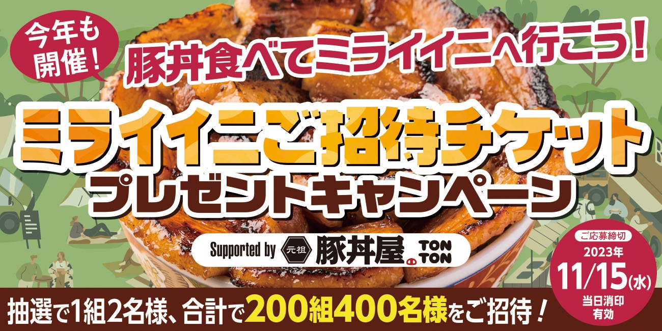 ワンズトライン株式会社が運営する『元祖豚丼屋TONTON』では、12/2(土)大阪・服部緑地野外音楽堂で開催される食とエンタメの祭典「ミライイニ」への1組2名様の招待チケットが抽選で合計200組400名様に当たるキャンペーンを10/15(日)より11/15(水)の期間おこないます。