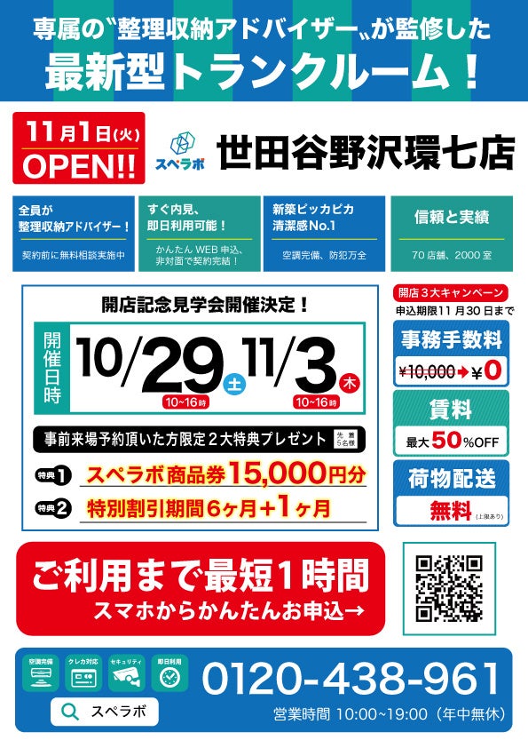 【11月1日(火)オープン】見学から契約、解約まで完全非接触・非対面、お申し込みからご利用まで最短1時間!都内にて絶賛運営中のトランクルーム【スペラボ】が世田谷区野沢環七沿いに出店!