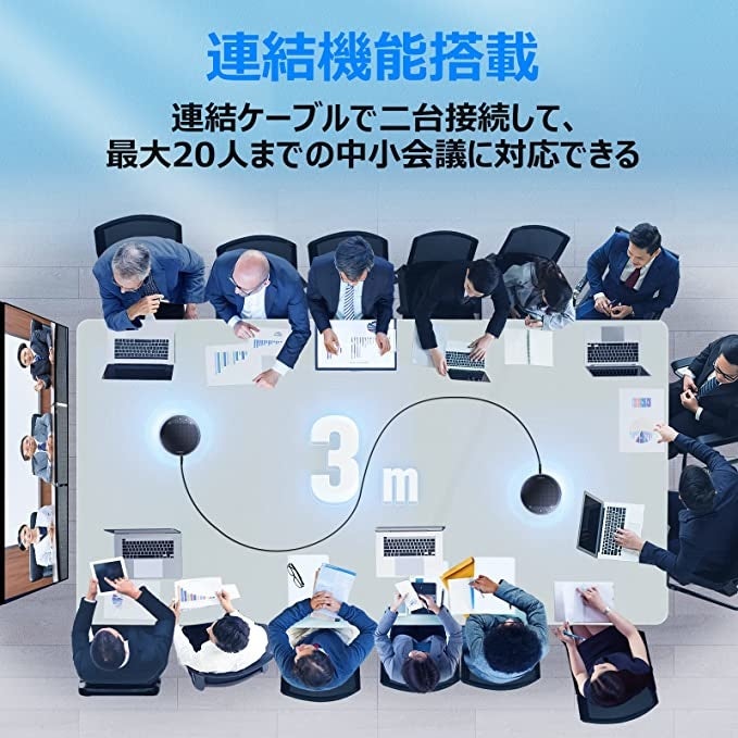 EMEET M3会議用マイクスピーカーはデバイスOS(PC、Mac、iOS、Android)を問わずに対応できます。また、Zoom、Skype、Microsoft Teams、Webex およびほとんどの会議ソフトと互換性があります。連結ケーブルを使い、M3スピーカーフォン/EMEET Meeting Capsule360度カメラとの連結ができ、収音範囲および再生範囲を倍に拡張して、12~20人の中小型会議にも対応可能です。