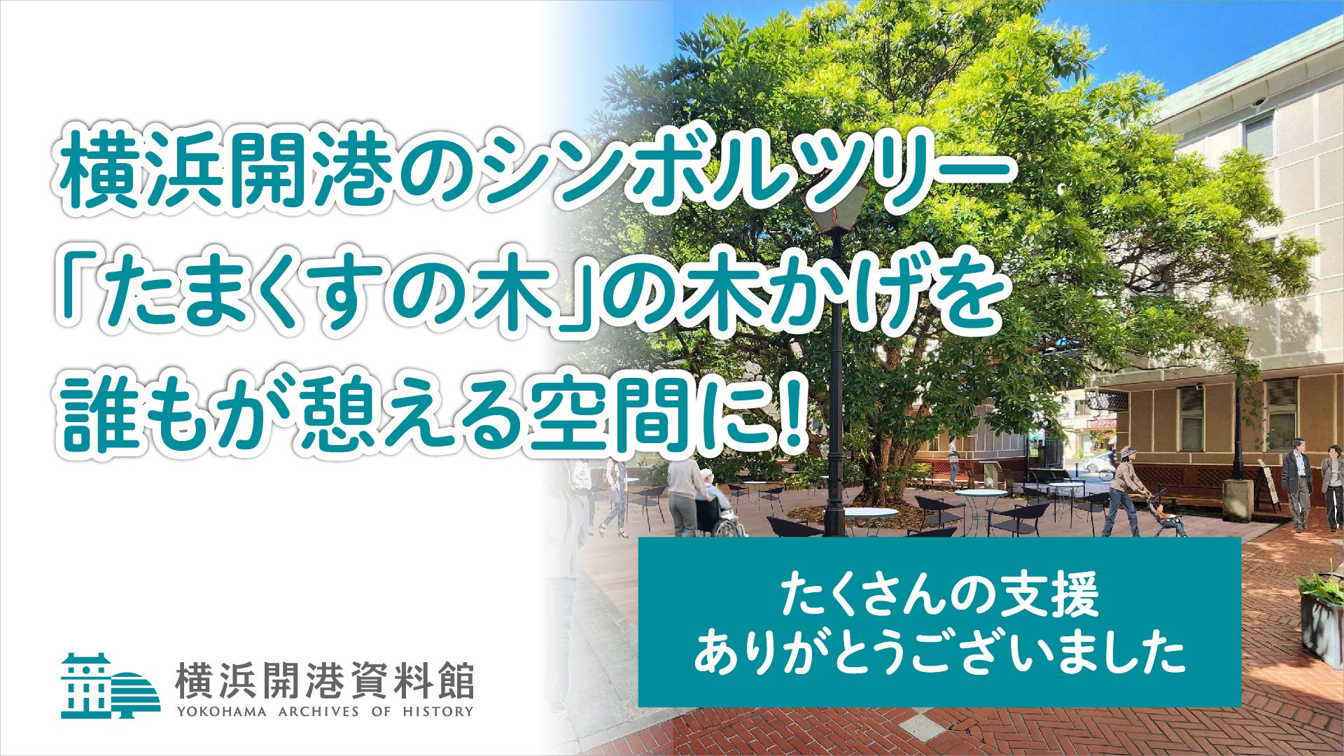 本年は安政元年(1854)にペリーが横浜に上陸し、日米和親条約が締結されてから170年の記念の年であり、ペリー上陸を見守り、慶応2年(1866)の火災と関東大震災という二度の大きな災害から復活した当館中庭にある「たまくすの木(横浜市地域史跡)」周辺について、バリアフリーデッキを整備するためにクラウドファンディングを実施しました。