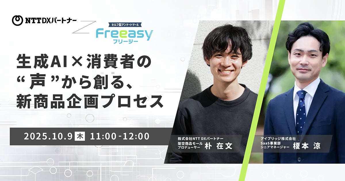 年間3万件以上の調査実績を誇る、国内最大級のセルフ型アンケートツール「Freeasy(フリージー)」を展開するアイブリッジ株式会社(本社:大阪市福島区、代表取締役社長:荒川和也)は、Freeasyオンラインセミナー『【Freeasy×NTT DXパートナー共催オンラインセミナー】生成AI×消費者の“声”から創る、新商品企画プロセス』を、2025年10月9日(木)11時から開催いたします。