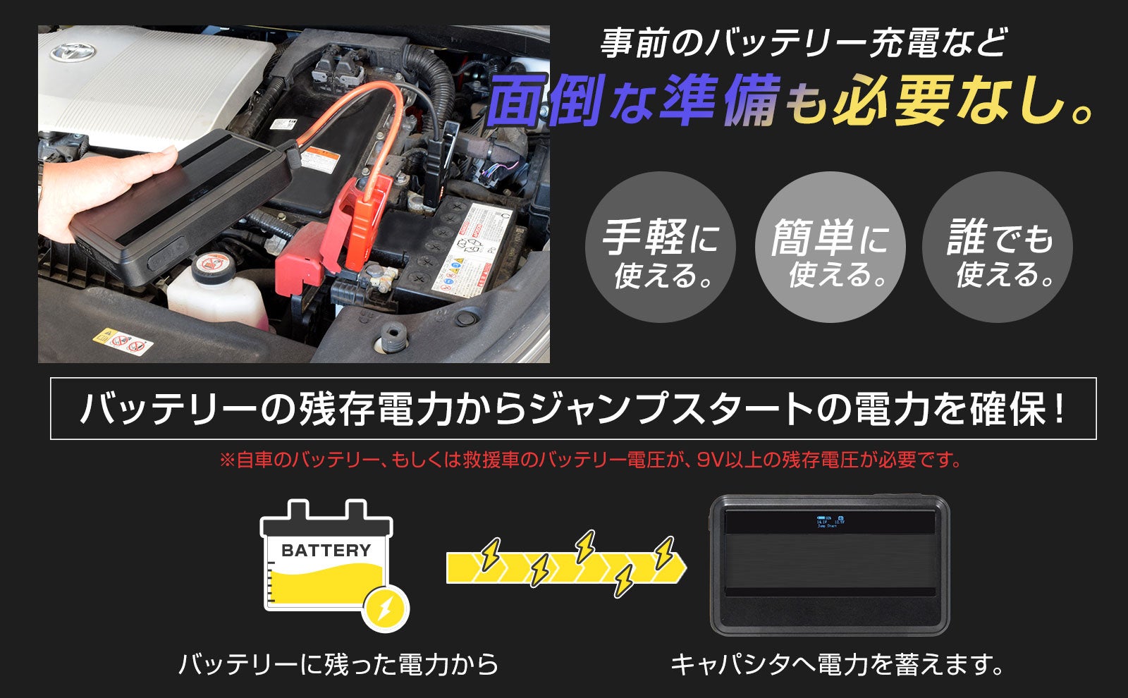 リチウムイオン電池を搭載していないから、充電の手間なし!自車のバッテリー残存電圧から即チャージ!革新的ジャンプスターターが楽天市場・Yahooで販売を開始しました。