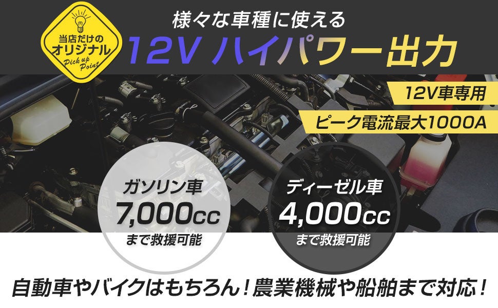 12V車専用設計で、排気量7000ccのガソリン車、4000ccのディーゼル車まで対応可能。さらに、トラクターなどの農業機械や船舶など、幅広い用途で使用可能です。