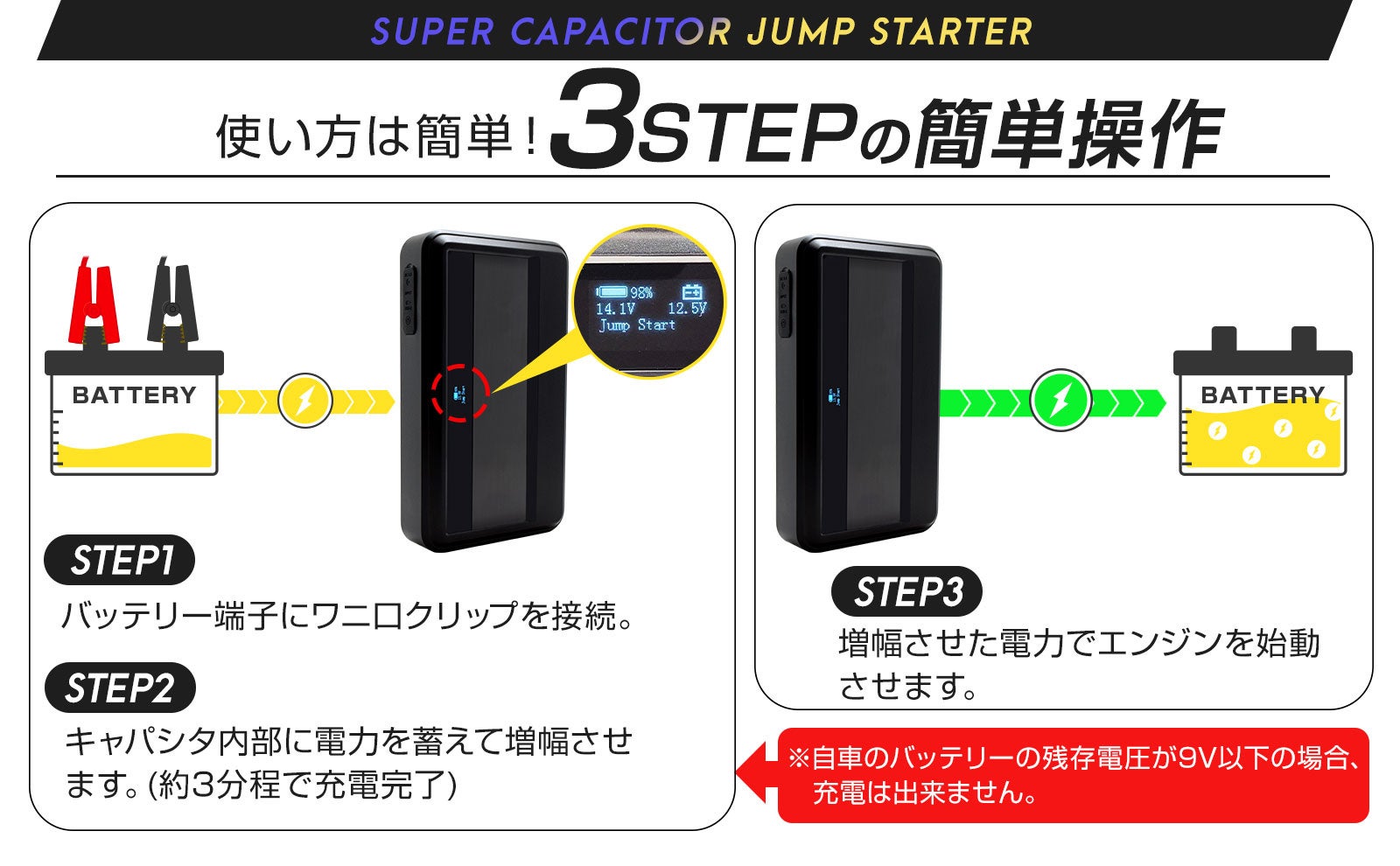 本製品は、高い安全性を誇るスーパーキャパシタ式ジャンプスターターです。使用時に必要な分だけの電力を蓄えて供給するため、リチウムイオンバッテリー搭載モデルのような膨張や破裂のリスクが極めて低い製品です。