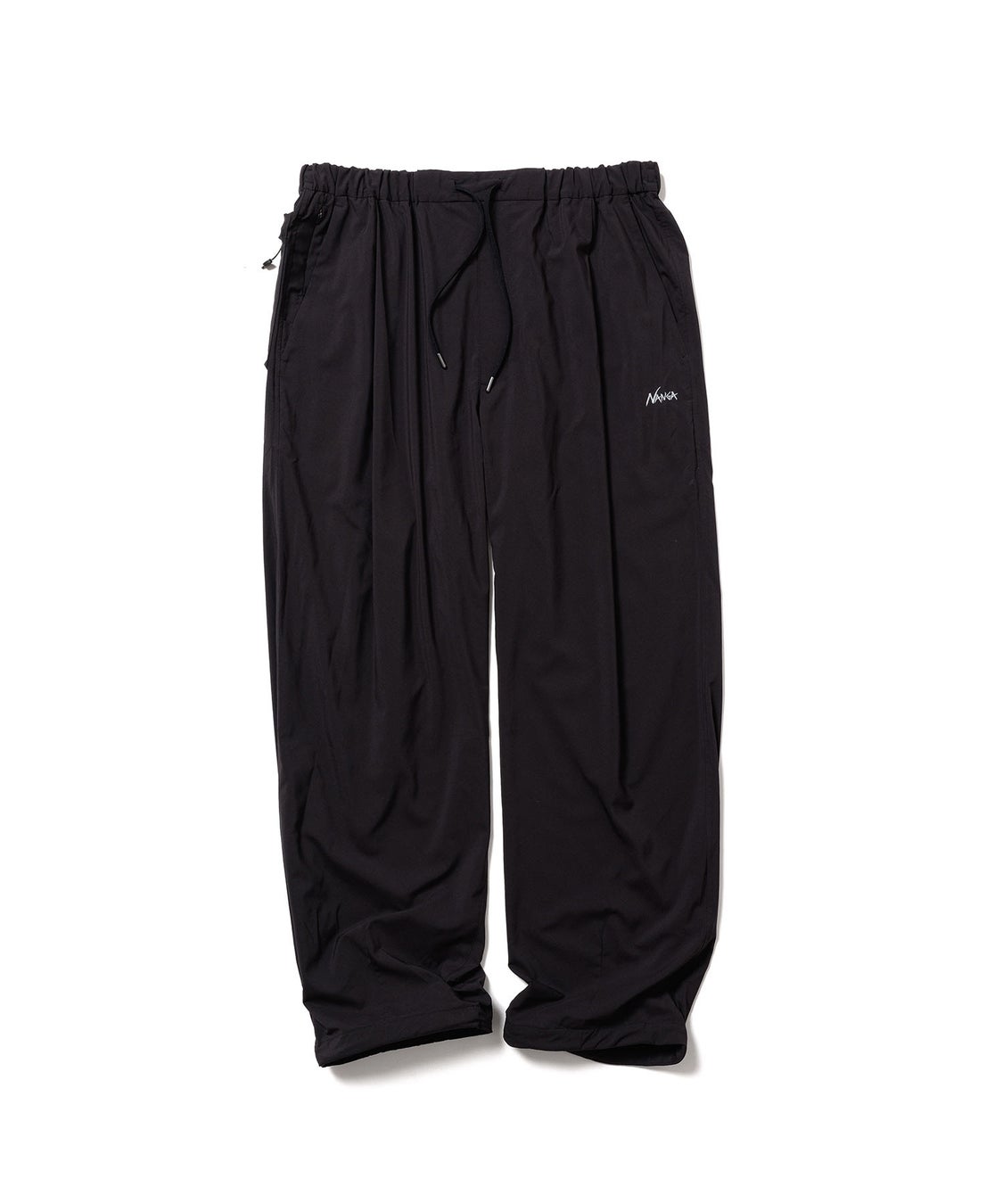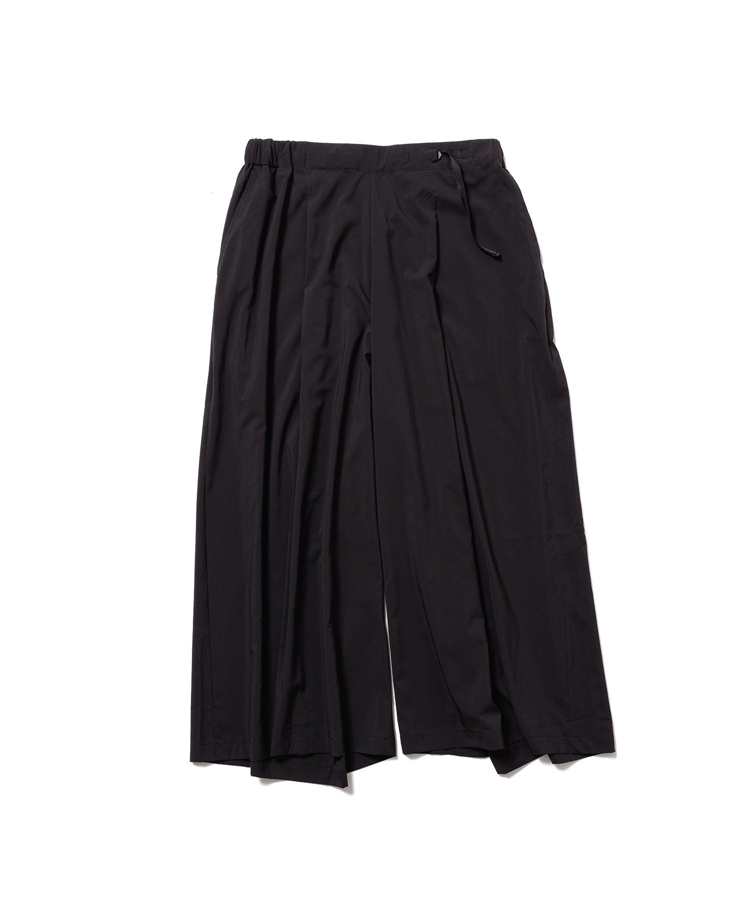 PLCシリーズのトップスとセットアップで楽しめる、ワイドシルエットのパンツです。腰にワンタックが入ったシンプルなデザインで、スピンドルによりウエストや裾口の絞り具合を好みに合わせて調整可能。パッカブル収納は右後ろのファスナーポケットを利用します。