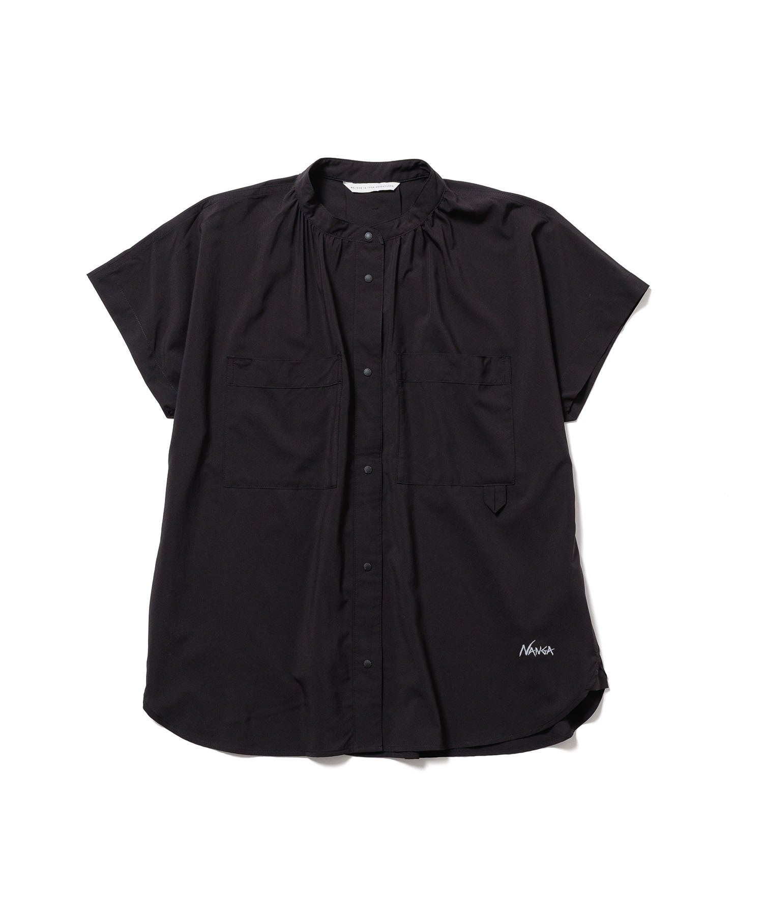 両胸のポケットやループでキャンプシャツの実用性を取り入れながら、ネック周りのギャザーや襟のデザインでフェミニンな印象に仕上げた半袖ブラウスです。ドライタッチでドレープ感の美しいポリエステル生地を採用した、軽く爽やかな着心地を楽しめる一枚です。