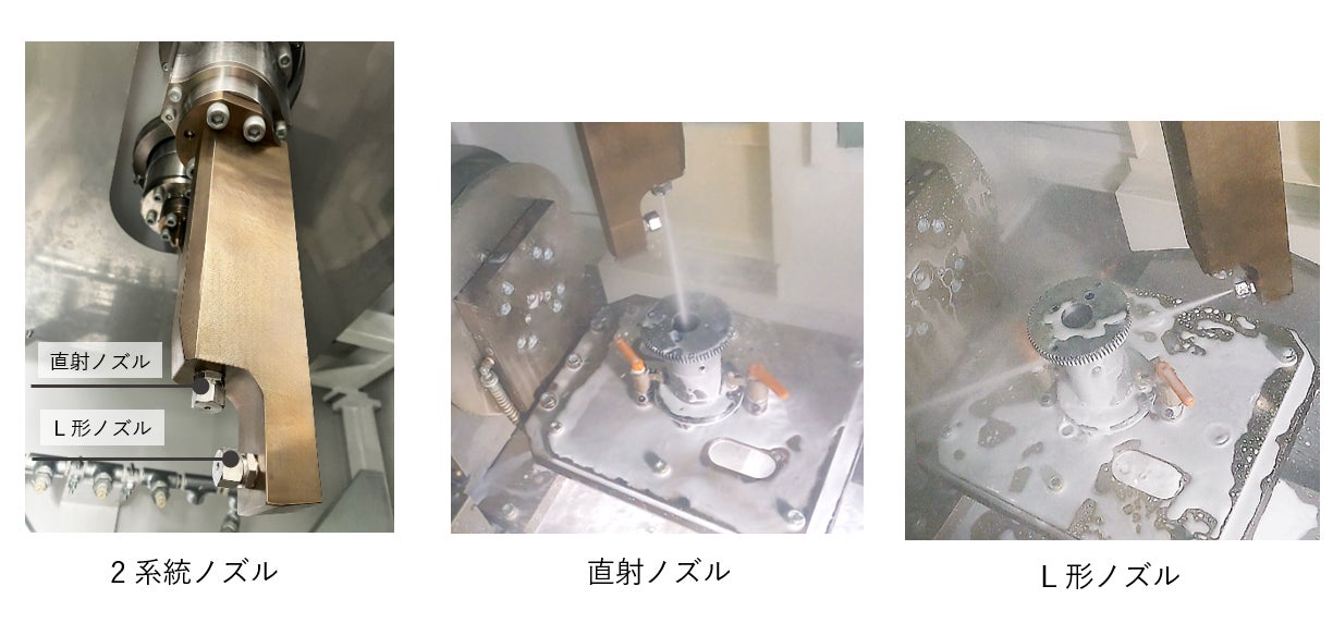 また、標準搭載の2系統ノズルは「直射ノズル」と「L形ノズル」を1本に集約した新型ノズルです。特許技術によってノズル内の流路を瞬時に切り替え、ノズルチェンジを効率化することでバリ取り工程におけるサイクルタイムの短縮を実現します。