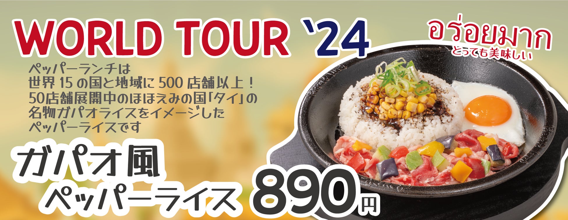 株式会社ホットパレット(本社:東京都江東区、代表取締役社長:松本純男)が展開するペッパーランチは、ブランド創設30周年記念キャンペーンの一環として、「ワールドツアー’24」キャンペーンを実施いたします。第1弾では、約50店舗を展開するタイをイメージした「ガパオ風ペッパーライス」を2024年7月24日(水)より販売いたします。