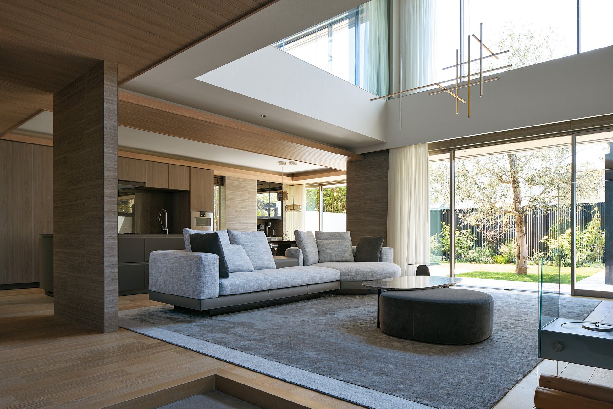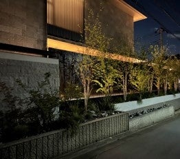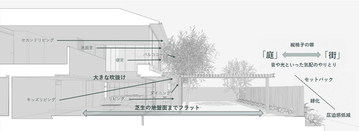 日常的に庭で過ごす時間を増やすことで、自然の要素や現象を五感で感じるとともに、住まいと接する地域への愛着が醸成すると考え、外部空間と住空間の調和をコンセプトに設計しました。庭の地盤面を持ち上げ室内床と完全にフラットにすることで、「続き間」のような感覚で気軽に庭に出るように促します。庭には開閉ルーバー屋根付きのタイルテラスを設置。オリーブの大樹を眺めながら食事や休息などさまざまな用途で活躍します。2階の居室からもリビングの大きな吹抜けを介して庭の大樹を眺めることができる設計や、室内と庭の配灯・調光の連動によって、外部空間と住空間のつながりを生み出します。さらに街並みの擁壁と緑化のリズムに沿って、外構の塀や緑地帯などをデザインしました