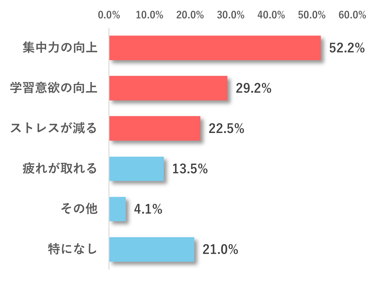 塾前食を食べると回答した414名を対象に、塾前食を食べることで、学習にどんな影響や効果があるか質問したところ、最多回答は「集中力の向上(52.2%)」、次に「学習意欲の向上(29.2%)」、「ストレスが減る(22.5%)」という結果になりました。塾前食を食べることで、半数以上の中学生が集中力があがっていることを実感しているようです。